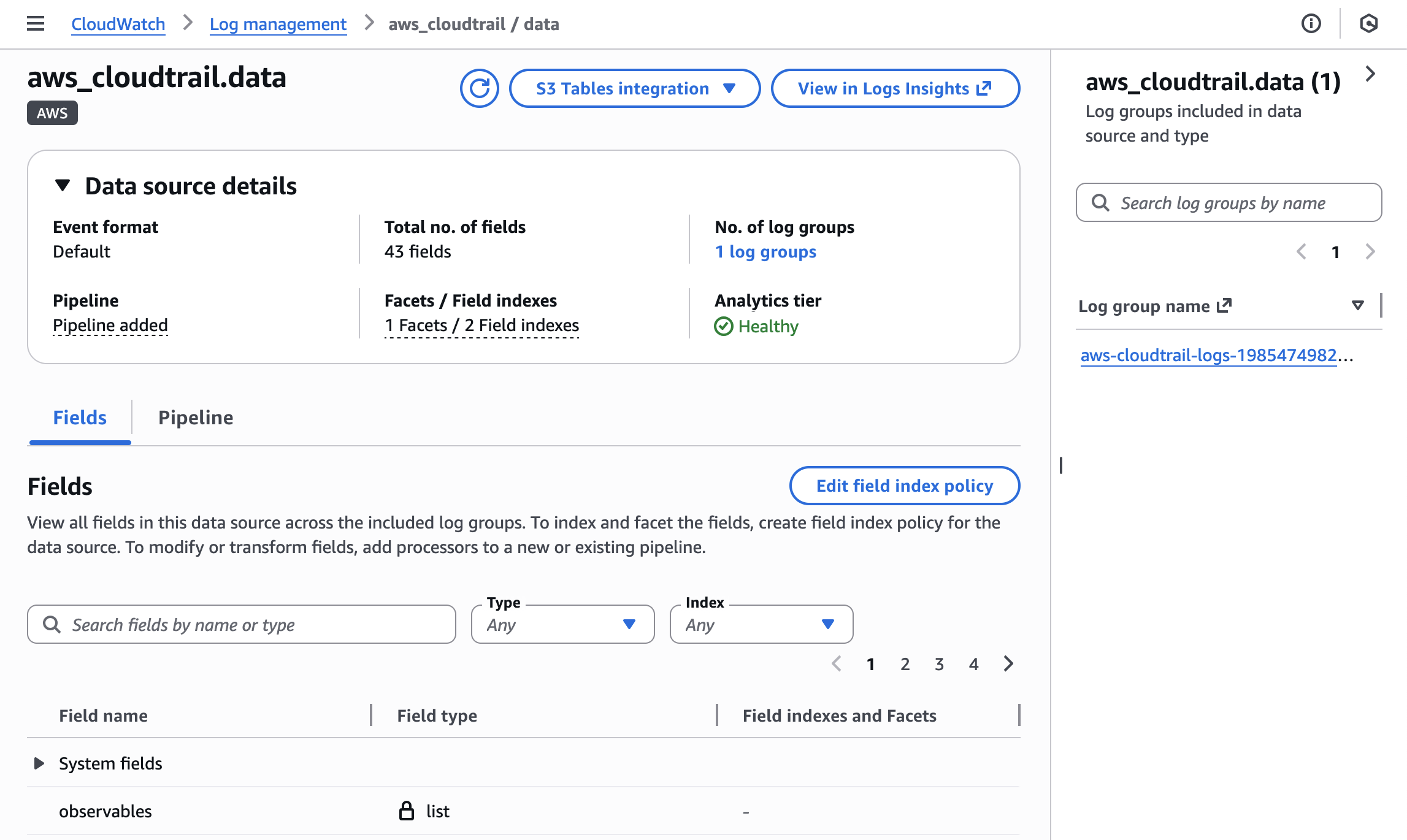Wenn Sie eine bestimmte Datenquelle wie CloudTrail-Daten auswählen, können Sie die Details der Datenquelle anzeigen, die Informationen zu Datenformat, Pipeline, Facets/Feldindizes, S3 Tables-Zuordnung und der Anzahl der Logs mit dieser Datenquelle enthalten. Sie können alle Log-Gruppen beobachten, die in dieser Datenquelle und diesem Typ enthalten sind, und eine Quell-/Typ-Feldindexrichtlinie mithilfe der neuen Schema-Unterstützung bearbeiten.