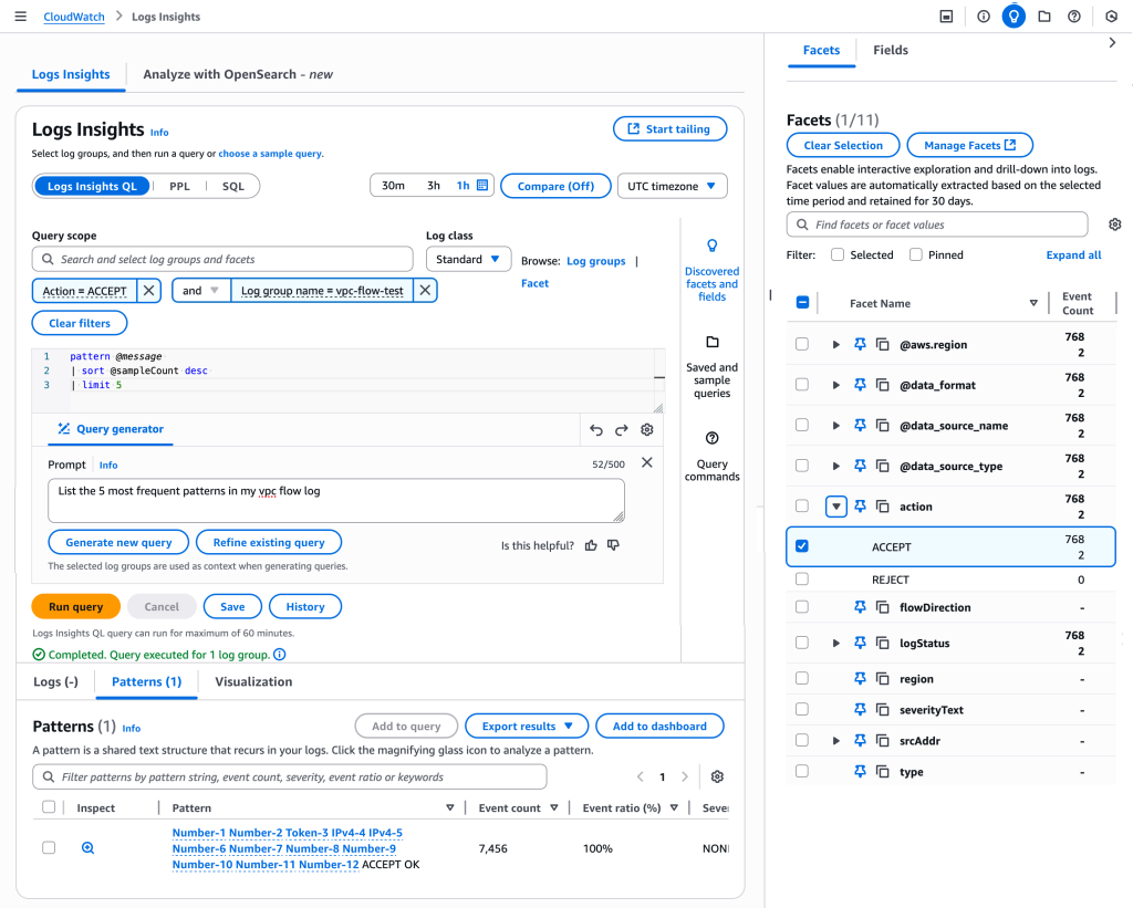 Wählen Sie den Tab Facets in Log Insights unter dem Menü Logs im linken Navigationsbereich. Sie können verfügbare Facets und Werte anzeigen, die im Panel erscheinen. Wählen Sie eine oder mehrere Facets und Werte aus, um Ihre Daten interaktiv zu erkunden. Ich wähle Facets bezüglich einer VPC Flow Logs-Gruppe und -Aktion, frage ab, um die fünf häufigsten Muster in meinen VPC Flow Logs über den AI-Abfragegenerator aufzulisten, und erhalte die Ergebnismuster.