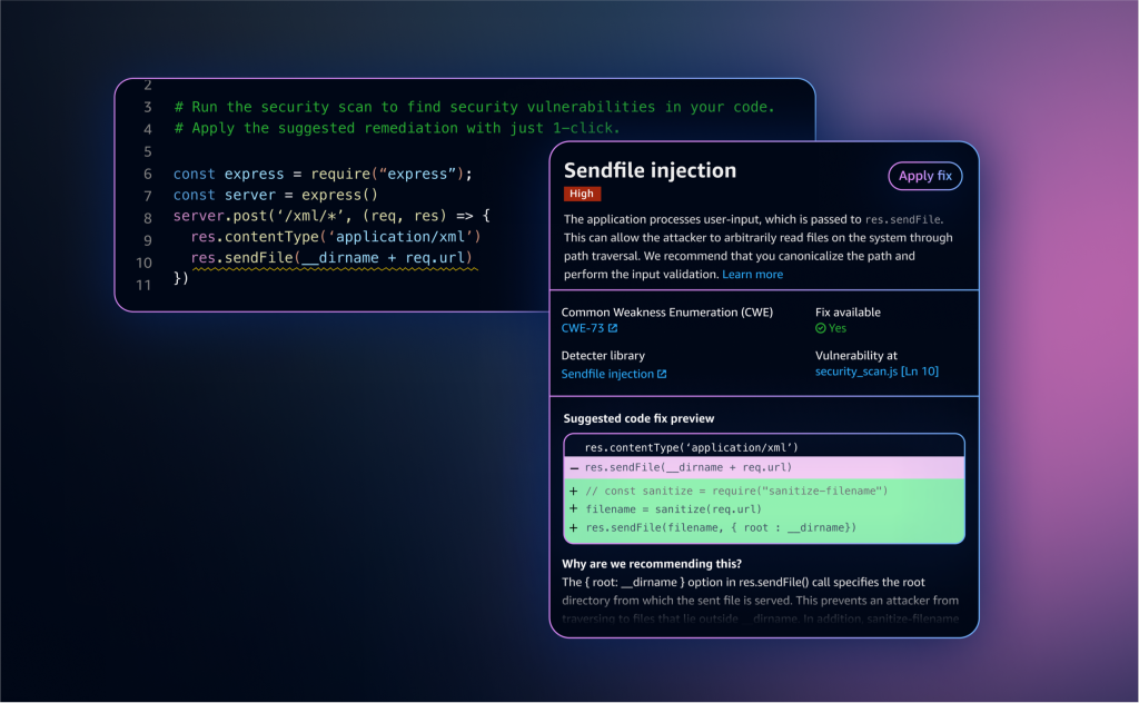 KI-gestützte Code-Korrektur: Seit seiner Einführung hat Amazon CodeWhisperer mit integrierten Sicherheits-Scans die Identifizierung schwer zu findender Sicherheitsschwachstellen ermöglicht. Jetzt bietet es Codevorschläge auf Basis von generativer KI, um identifizierte Sicherheits- und Codequalitäts-Probleme zu beheben. Das integrierte Sicherheits-Scanning ist darauf ausgelegt, Probleme wie ungeschützte Zugangsdaten und Log-Injection (das Einfügen nicht vertrauenswürdiger oder nicht validierter Daten in eine Protokolldatei) zu erkennen. Code-Vorschläge auf Basis von generativer KI dienen der Behebung der identifizierten Schwachstellen und sind dabei auf Ihren Anwendungscode zugeschnitten. So können Sie die Korrekturen schnell und verlässlich akzeptieren. Sobald ein Sicherheitsscan in CodeWhisperer abgeschlossen wurde, werden Ihnen Code-Vorschläge präsentiert, die Sie einfach akzeptieren können, um die identifizierten Schwachstellen schnell zu schließen. Code-Vorschläge auf Basis von generativer KI beschleunigen den Prozess der Behebung von Sicherheitsproblemen. Dadurch können Sie sich auf wichtigere Arbeiten konzentrieren, anstatt den Code manuell Zeile für Zeile zu überprüfen, um eine geeignete Lösung zu finden. Sie brauchen keine zusätzlichen Einstellungen in Amazon CodeWhisperer vorzunehmen, um diese Funktion nutzen zu können.