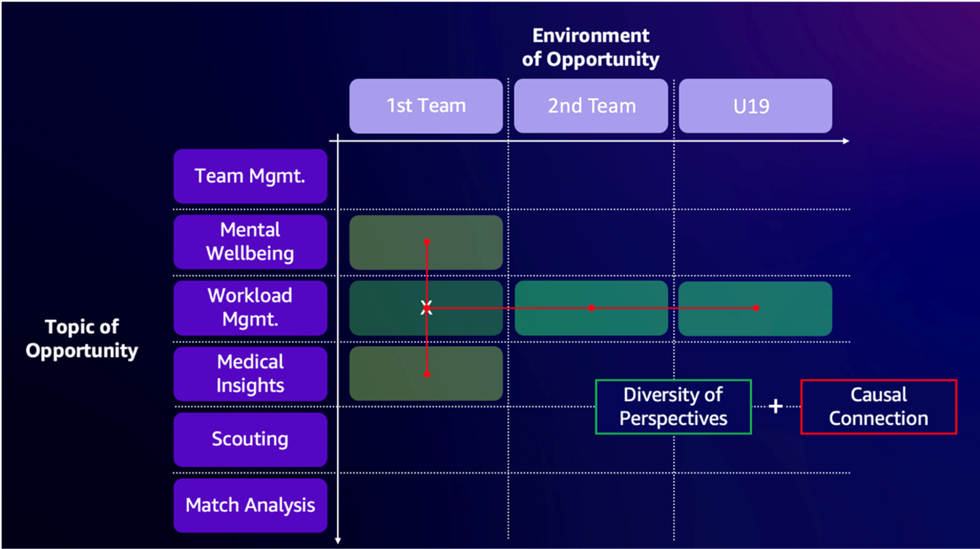 Holstein Kiels-Lösungsraum erstreckt sich somit über drei Dimensionen: Anwendungsbereiche („Topic of Opportunity“), Teams („Environment of Opportunity“) und Datenquellen. Zusammengehalten wird alles durch die Spieler-ID als zentralen Identifikator (siehe Abbildung 1). Diese durchgängige Dokumentation erfasst die Individualität jedes Spielers und seine Entwicklung über Jahre hinweg. Dadurch entstehen detailreiche Profile mit wertvollen Kontextinformationen, die Basis für gezielte Förderung und eine optimale Wertentwicklung der Spieler sind.