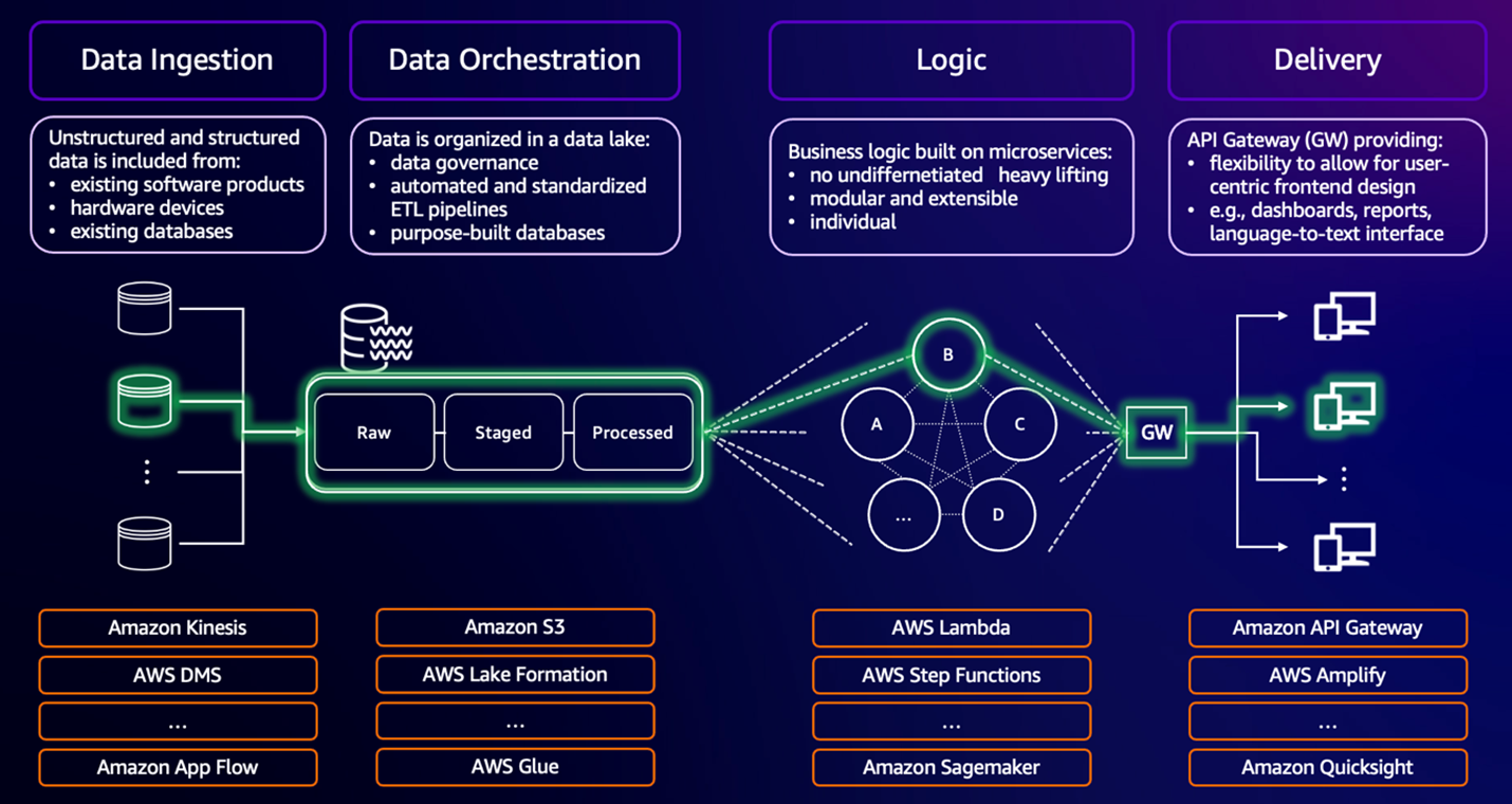 Um das beschriebene Modell umzusetzen, hat Holstein Kiel gemeinsam mit AWS fünf technische Grundprinzipien definiert. Diese umfassen Skalierbarkeit, Standardisierung und Automatisierung, demokratisierten und sicheren Datenzugang, modulare Architektur sowie ereignisgesteuerte und logisch verknüpfte Funktionen.