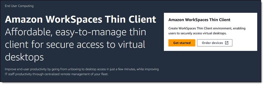 Der neue Amazon WorkSpaces Thin Client ermöglicht es Endnutzern und IT-Personal, ihre Produktivität zu steigern. Dies wird durch einen preiswerten, sicheren und leicht zu verwaltenden Zugriff auf virtuelle Desktops erreicht. Diese Geräte sind bereits voreingestellt und werden direkt an die Nutzer versendet, sodass sie sofort einsatzbereit sind.