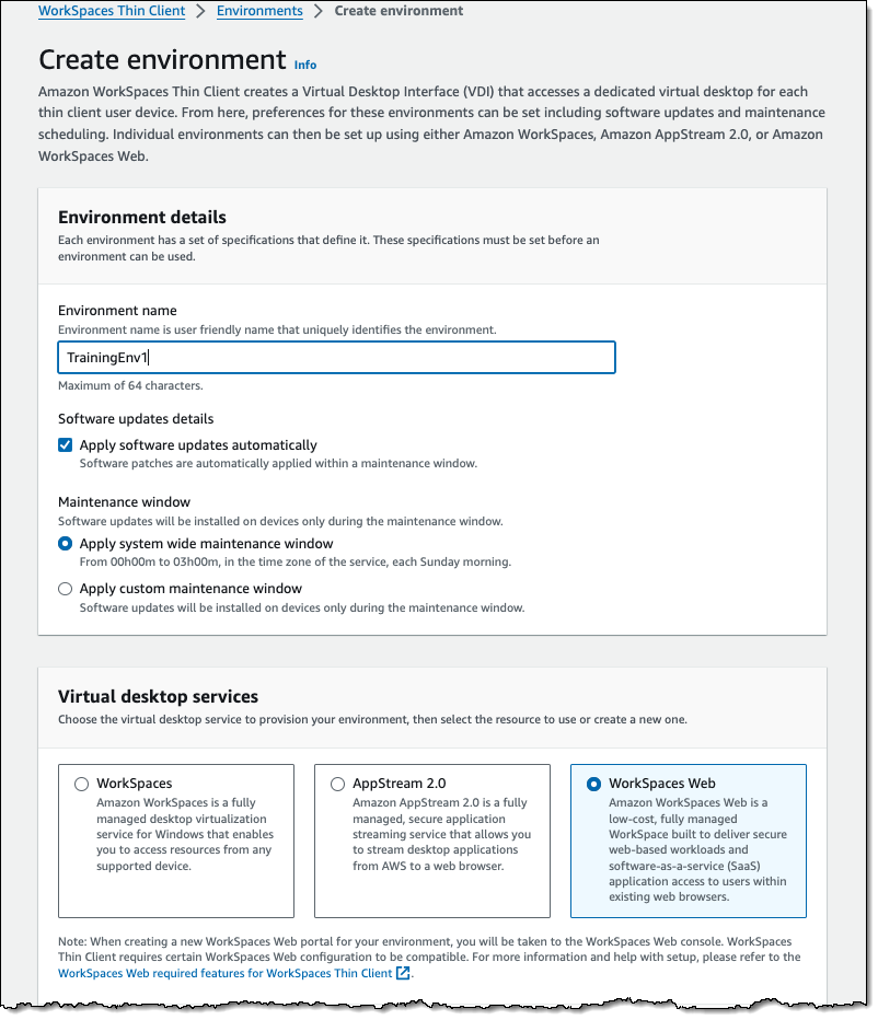 Ich gebe meiner Umgebung einen Namen, gebe an, dass ich Patches automatisch anwenden lassen möchte, und wähle WorkSpaces Web: