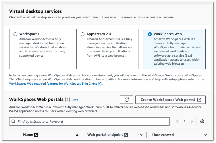 In jeder Amazon WorkSpaces Thin Client-Umgebung können Nutzer auf einen bestimmten virtuellen Desktop-Dienst zugreifen, sei es WorkSpaces, WorkSpaces Web oder Amazon AppStream 2.0. Um fortzufahren, klicke ich als Administrator auf „Umgebung erstellen“ (Create environment).