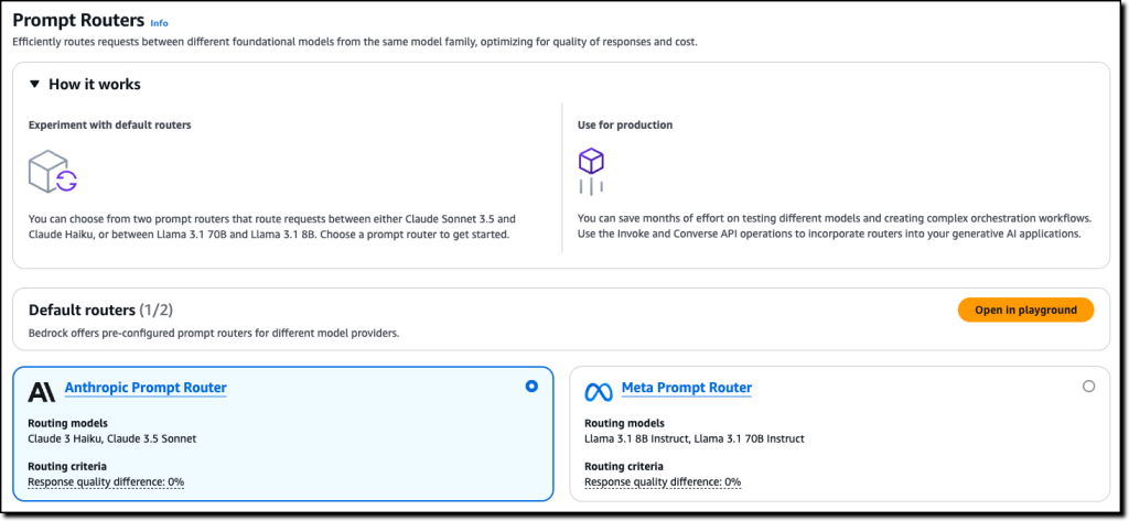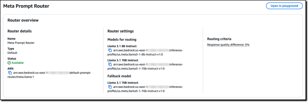 { "promptRouterName": "Meta Prompt Router", "routingCriteria": { "responseQualityDifference": 0.0 }, "description": "Routes requests among models in the LLaMA family", "createdAt": "2024-11-20T00:00:00+00:00", "updatedAt": "2024-11-20T00:00:00+00:00", "promptRouterArn": "arn:aws:bedrock:us-east-1:123412341234:default-prompt-router/meta.llama:1", "models": [ { "modelArn": "arn:aws:bedrock:us-east-1:123412341234:inference-profile/us.meta.llama3-1-8b-instruct-v1:0" }, { "modelArn": "arn:aws:bedrock:us-east-1:123412341234:inference-profile/us.meta.llama3-1-70b-instruct-v1:0" } ], "fallbackModel": { "modelArn": "arn:aws:bedrock:us-east-1:123412341234:inference-profile/us.meta.llama3-1-70b-instruct-v1:0" }, "status": "AVAILABLE", "type": "default"}