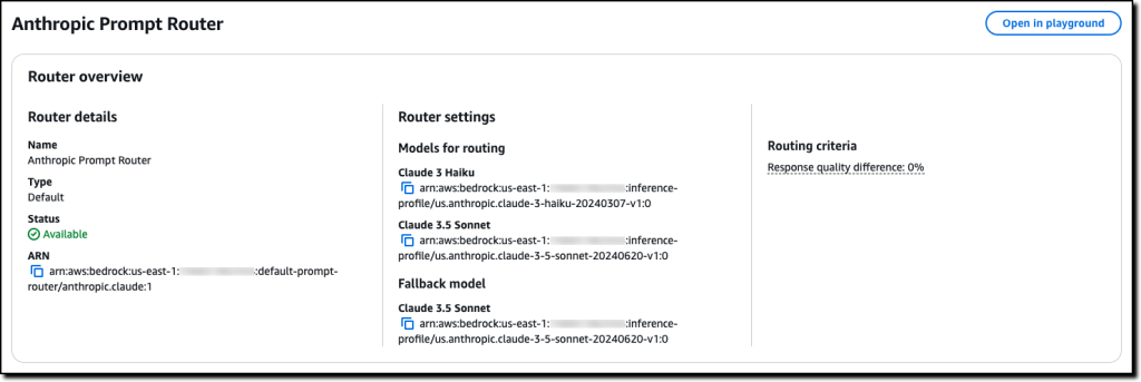 Anhand der Konfiguration des Prompt-Routers sehe ich, dass er Anfragen zwischen Claude 3.5 Sonnet und Claude 3 Haiku unter Verwendung von regionsübergreifenden Inferenzprofilen routet. Die Routing-Kriterien definieren den Qualitätsunterschied zwischen der Antwort des größten Modells und des kleinsten Modells für jeden Prompt, wie er vom internen Modell des Routers zur Laufzeit vorhergesagt wird. Das Fallback-Modell, das verwendet wird, wenn keines der ausgewählten Modelle die gewünschten Leistungskriterien erfüllt, ist Anthropic’s Claude 3.5 Sonnet.