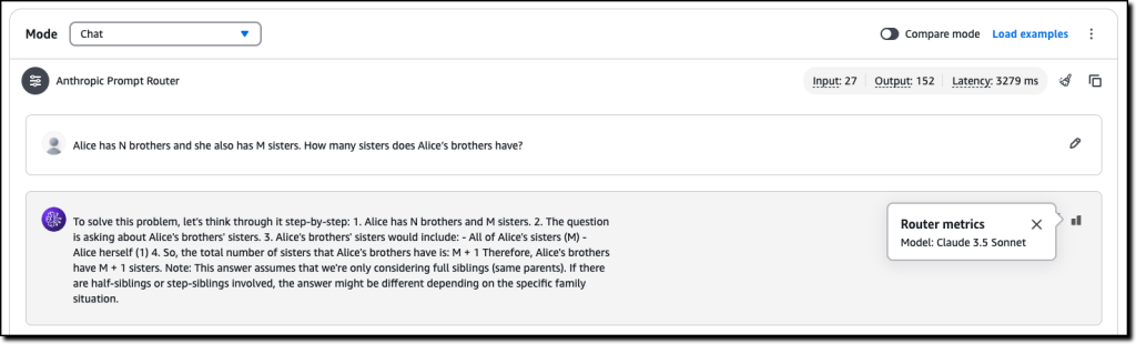{ "output": { "message": { "role": "assistant", "content": [ { "text": "To solve this problem, let's think it through step-by-step:\n\n1) First, we need to understand the relationships:\n - Alice has N brothers\n - Alice has M sisters\n\n2) Now, we need to consider who Alice's brothers' sisters are:\n - Alice herself is a sister to all her brothers\n - All of Alice's sisters are also sisters to Alice's brothers\n\n3) So, the total number of sisters that Alice's brothers have is:\n - The number of Alice's sisters (M)\n - Plus Alice herself (+1)\n\n4) Therefore, the answer can be expressed as: M + 1\n\nThus, Alice's brothers have M + 1 sisters." } ] } }, . . . "trace": { "promptRouter": { "invokedModelId": "arn:aws:bedrock:us-east-1:123412341234:inference-profile/us.anthropic.claude-3-5-sonnet-20240620-v1:0" } }}
