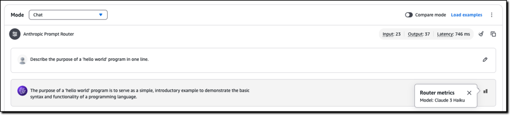 Das Ergebnis wird schnell geliefert. Ich wähle das neue Symbol Router Metrics auf der rechten Seite, um zu sehen, welches Modell vom Prompt-Router ausgewählt wurde. In diesem Fall wurde Anthropic’s Claude 3.5 Sonnet verwendet, da die Frage recht komplex ist.