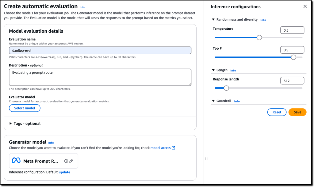 Prompt-Router sind mit anderen Amazon Bedrock-Funktionen integriert, so z.B. Amazon Bedrock Knowledge Bases, Amazon Bedrock Agents, oder Modelevaluierungen. Hier erstelle ich beispielsweise eine Modellevaluierung, um für meinen Anwendungsfall einen Prompt-Router mit einem anderen Modell oder Prompt-Router zu vergleichen.