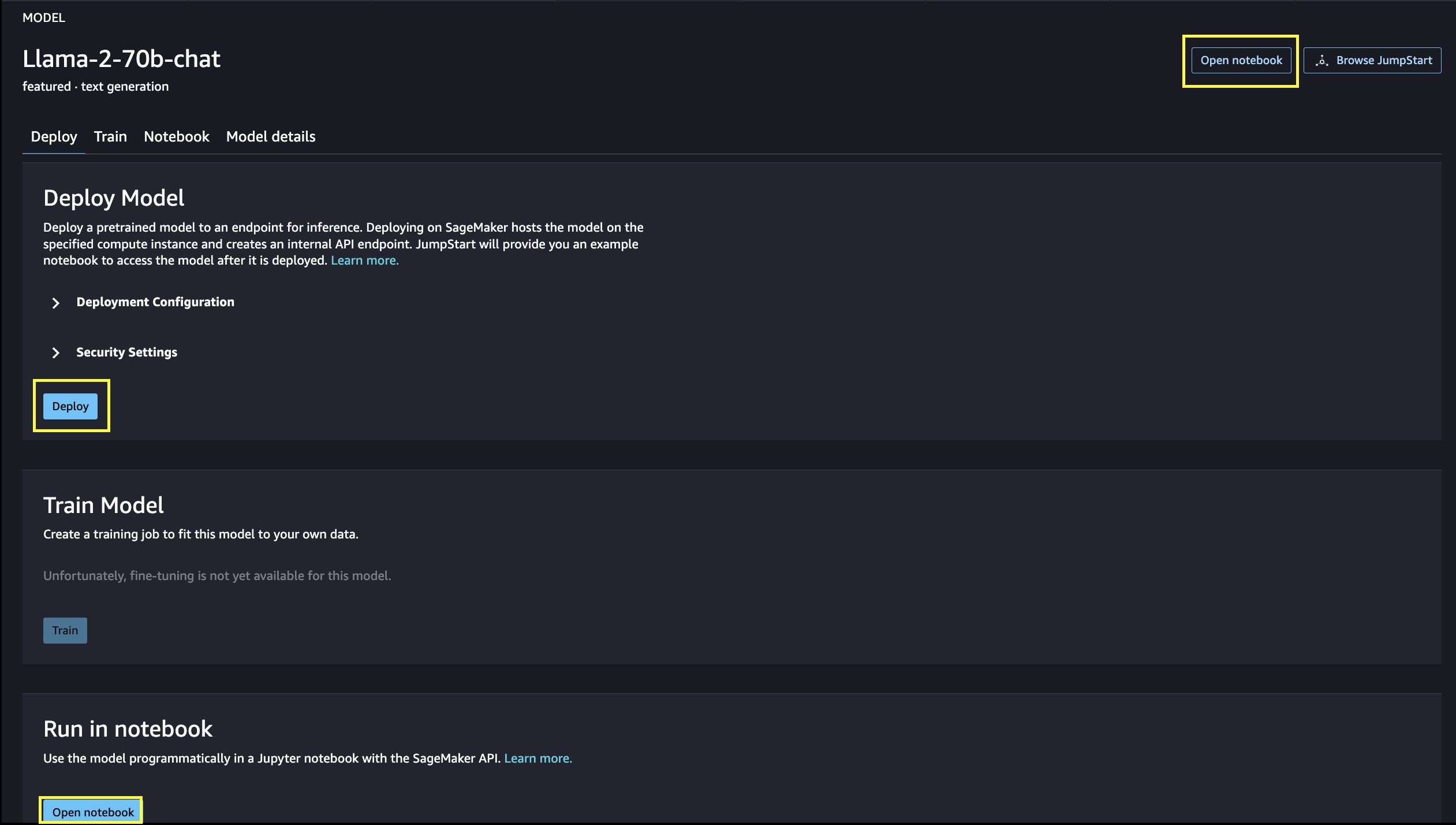 Wenn Sie „Deploy“ wählen und die Bedingungen anerkennen, beginnt die Modellbereitstellung. Alternativ können Sie die Bereitstellung über das Beispiel-Notebook starten. Dieses erscheint, wenn Sie “Open Notebook“ wählen. Das Beispiel-Notebook bietet eine durchgehende Anleitung zur Bereitstellung des Modells für Inferenzen und zur Bereinigung von Ressourcen.