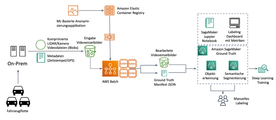 Daten, die in den Fahrzeugen gesammelt und vor Ort gespeichert wurden, werden mithilfe von Datenübertragungsservices wie AWS Storage Gateway, AWS Direct Connect, AWS DataSync, AWS Snowball oder AWS Transfer Family an AWS übertragen. Amazon SageMaker Ground Truth ist ein vollständig verwalteter Datenkennzeichnungsservice, der Flexibilität für die Erstellung und Verwaltung benutzerdefinierter ML-Prozesse bietet. Mit Ground Truth kennzeichnen Sie auch Bild-, Video- und Punktwolkendaten für Objekterkennungs- und Objektverfolgungsaufgaben und führen semantische Segmentierungen durch. Nachdem die Daten vorverarbeitet wurden (z. B. Verwischen von Gesichtern und Nummernschildern), ist der bereinigte Datensatz bereit für die Kennzeichnung durch Amazon SageMaker Ground Truth. Ground Truth unterstützt die Datenfusion von LiDAR-Daten mit Video-Daten von Digitalkameras. In Amazon Sage Maker Ground Truth wählen Sie, ob Sie die Daten manuell mit Hilfe von Amazon Mechanical Turk durch vertrauenswürdige Drittanbieter oder durch Ihre eigene Belegschaft kennzeichnen möchten.