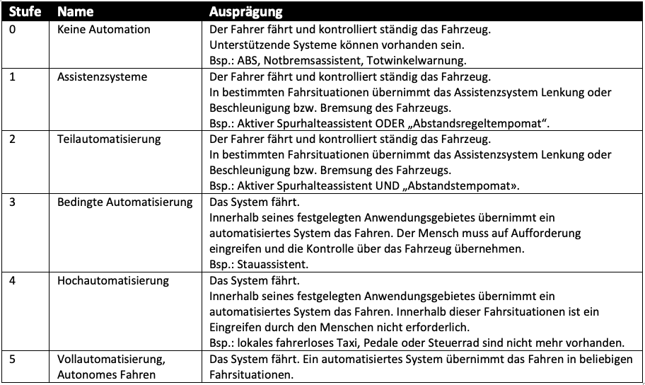 Die internationale SAE Norm SAE J3016 (ehemals: Society of Automotive Engineers) definiert sechs Stufen der Fahrzeugautomatisierung und ist die am häufigsten zitierte Quelle für Fahrzeugautomatisierung. Wie in der folgenden Tabelle dargestellt reicht er von Stufe 0 (keine Automation,) bis zur Stufe 5 (Vollautomatisierung).