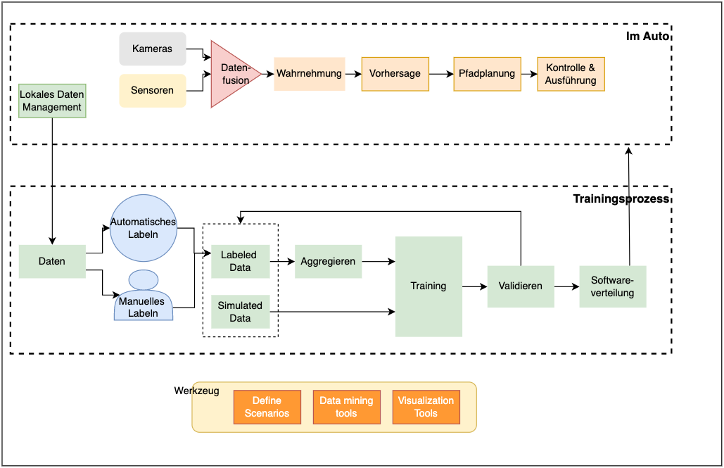 - Trainingsprozess — Neuronale Netzwerke, die in Fahrerassistenzsystemen verwendet werden mit gesammelten Fahrzeugdaten trainiert. Das geschieht in der Regel offline und ausserhalb des Fahrzeugs. Für dieses Training werden Tausende von Recheneinheiten über einen längeren Zeitraum benötigt. Die erforderliche Datenmenge und die benötigte Rechenleistung variieren je nach Modellarchitektur und Systemanbieter. Um neuronale Netzwerke zu trainieren, werden markierte Daten benötigt, wobei dieses sogenannte «Tagging» teilweise manuell und teilweise automatisiert erfolgt. Personenbezogene Daten wie Nummernschild und Gesicht werden durch Unschärfe anonymisiert. Anbieter ergänzen die markierten Daten durch die Ergebnisse von Simulationen. Sie bieten die Möglichkeit zusätzliche Trainingsdaten für bestimmte Szenarien zu generieren, um damit Daten aus der realen Welt zu ergänzen.