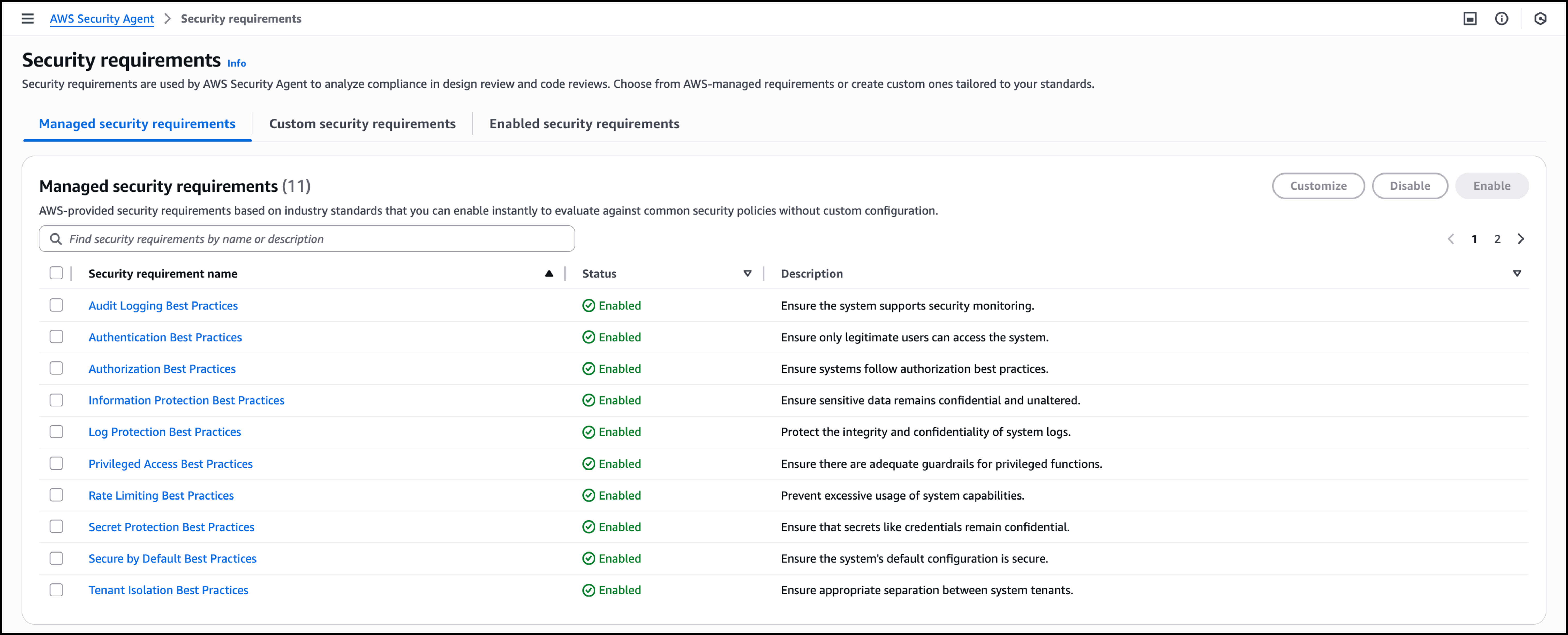 Bevor Sie Entwurfsüberprüfungen durchführen, bestätigen Sie, dass Sie die Sicherheitsanforderungen konfiguriert haben, die AWS Security Agent überprüfen wird. Sie können mit von AWS verwalteten Sicherheitsanforderungen beginnen oder benutzerdefinierte Anforderungen definieren, die auf Ihre Organisation zugeschnitten sind, wie im Abschnitt Sicherheitsanforderungen beschrieben.