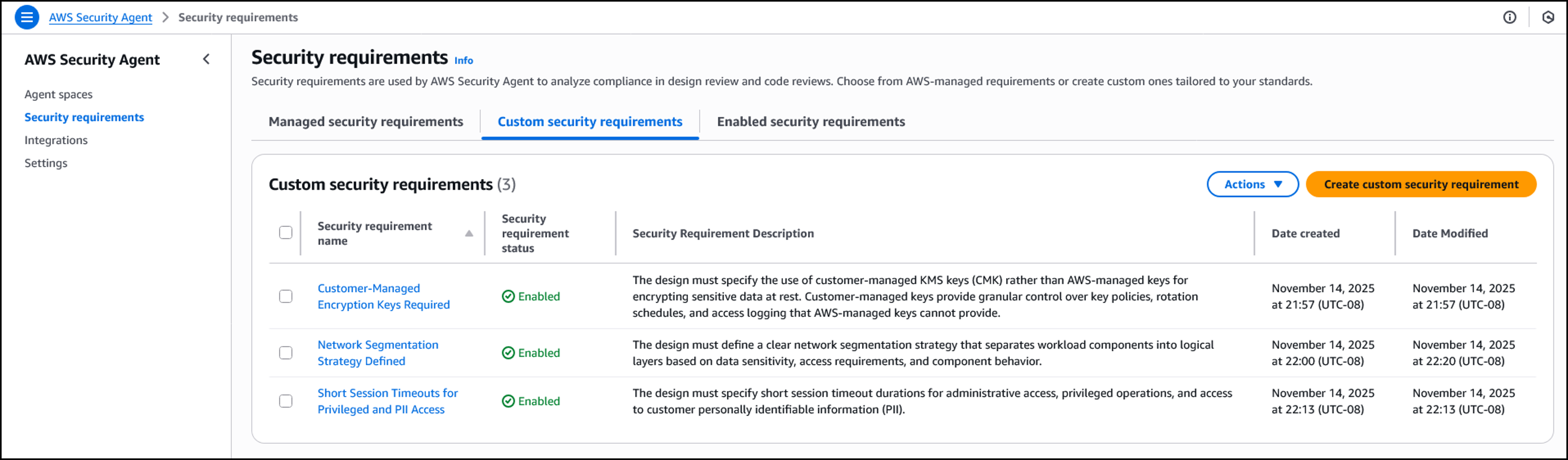 Beim Erstellen einer benutzerdefinierten Sicherheitsanforderung geben Sie den Name der Sicherheitsanforderung und die Beschreibung an, die die Richtlinie definiert. Sie könnten beispielsweise eine Anforderung namens Definierte Netzwerksegmentierungsstrategie erstellen, die verlangt, dass Designs eine klare Netzwerksegmentierung definieren, die Workload-Komponenten basierend auf der Datensensitivität in logische Schichten trennt. Oder Sie könnten Kurze Session Timeouts fuer Priviligierten und PII Zugriff definieren, um spezifische Zeitüberschreitungsdauern für priviligierten Zugriff und Zugriff auf personenbezogene Daten (PII) vorzuschreiben. Ein weiteres Beispiel ist Kunden-verwaltete Verschlüsselungsschlüssel erforderlich. Diese Anforderung verlangt, dass Designs vom Kunden verwaltete AWS Key Management Service (AWS KMS)-Schlüssel anstelle von AWS-verwalteten Schlüsseln für die Verschlüsselung sensibler Daten im Ruhezustand angeben. AWS Security Agent bewertet Designs und Code anhand dieser aktivierten Anforderungen und identifiziert Richtlinienverstöße.
