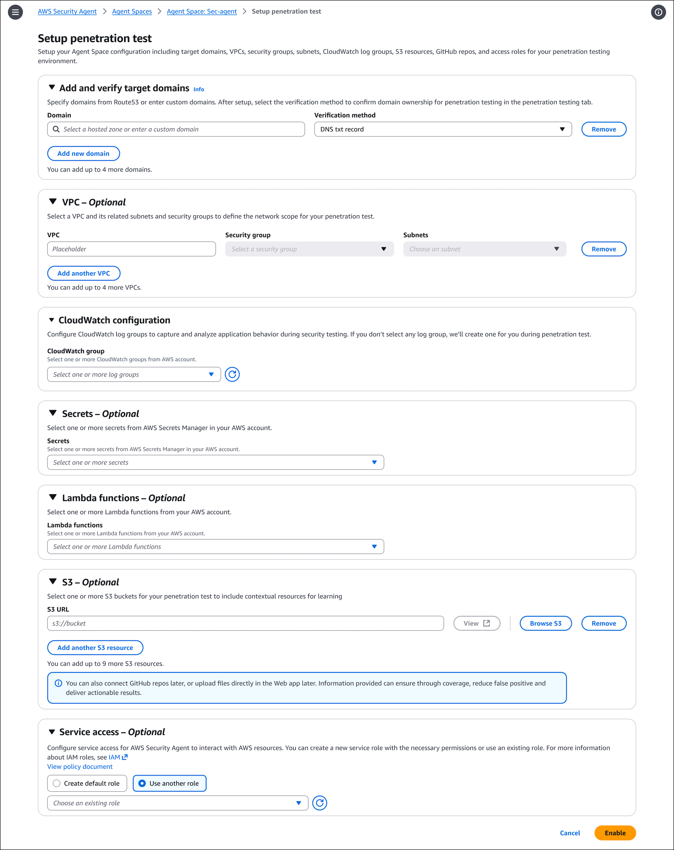 Um Penetrationstests zu aktivieren, wählen Sie Penetrationstest aktivieren auf der Agent-Konfigurationsseite. Sie können Zieldomänen, VPC-Einstellungen für private Endpunkte, Authentifizierungsanmeldeinformationen und zusätzliche Kontextquellen wie GitHub-Repositories oder S3-Buckets konfigurieren. Sie müssen das Eigentum an jeder Domäne verifizieren, bevor AWS Security Agent Penetrationstests durchführen kann.