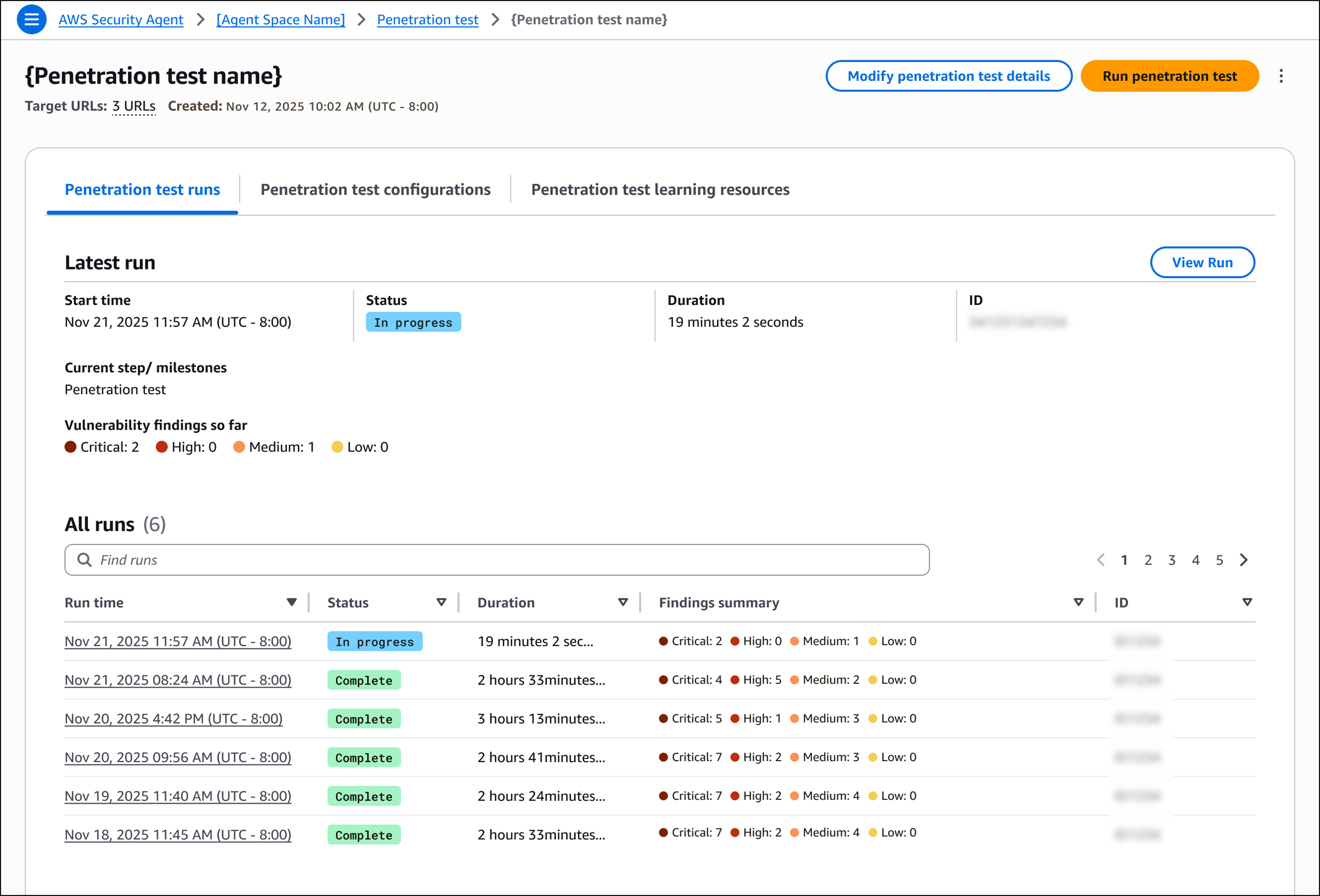 Nach dem Aktivieren der Funktion erstellen und führen Sie Penetrationstests über die AWS Security Agent Webapplikation durch. Detaillierte Einrichtungs- und Konfigurationsanweisungen finden Sie in der AWS Security Agent-Dokumentation [EN].