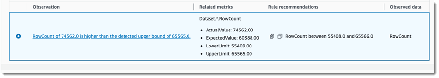Sobald aktiviert, nutzt dieser coole neue Zusatz zu Glue Data Quality Statistiken ML und dynamischen Schwellenwerte, wenn neue Daten eintreffen. Dadurch kann aus vergangenen Mustern gelernt werden und gleichzeitig Ausreißer und ungewöhnliche Datenmuster erkannt werden. Dieser Prozess erzeugt Beobachtungen und visualisiert Trends, sodass Sie schnell ein besseres Verständnis der Anomalie erhalten können.