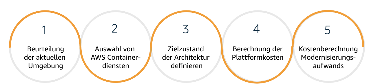 Um das beschriebene Vorgehen besser zu verdeutlichen, führen wir den Fünf-Schritte-Prozess an einem beispielhaften Workload durch. Zunächst ist es erforderlich, die Schritte 1 bis 3 zu vollziehen, um festzulegen, welche Anwendungen wir in AWS-Container überführen möchten, bevor wir mit der Kostenschätzung beginnen.