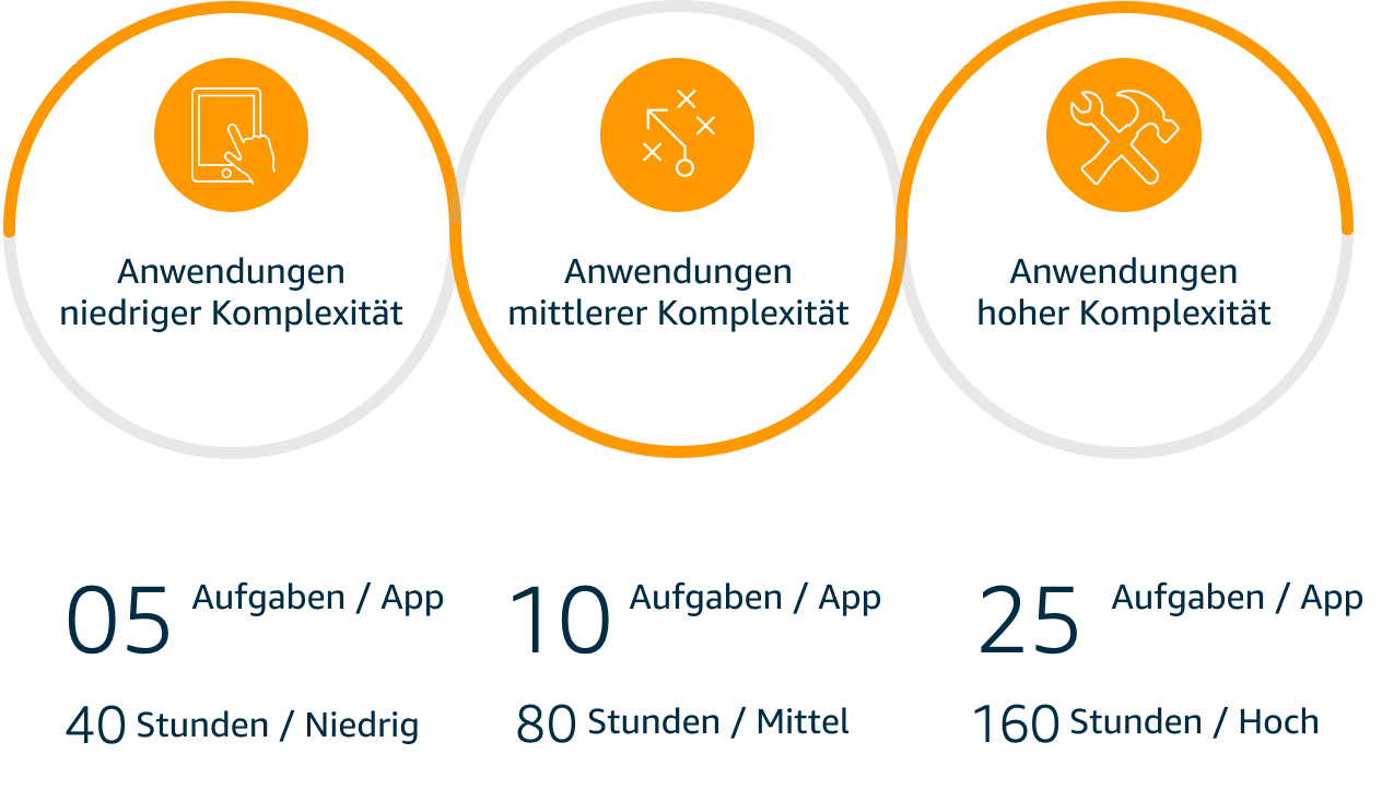 Um Ihren Workload effizienter zu schätzen, können Sie Muster in diesen identifizieren. Dies vereinfacht den Prozess, besonders für die Schritte 4 und 5. Hierbei können Sie ein von AWS Professional Services entwickeltes Modell zur Containerisierung nutzen. Dieses Modell ordnet Anwendungen basierend auf ihrer Komplexität in drei Kategorien ein: niedrig, mittel und hoch. Jede Kategorie spiegelt den Aufwand wider, der für die Containerisierung der Anwendungen und die erforderlichen Tasks zum Betrieb auf ECS benötigt wird.