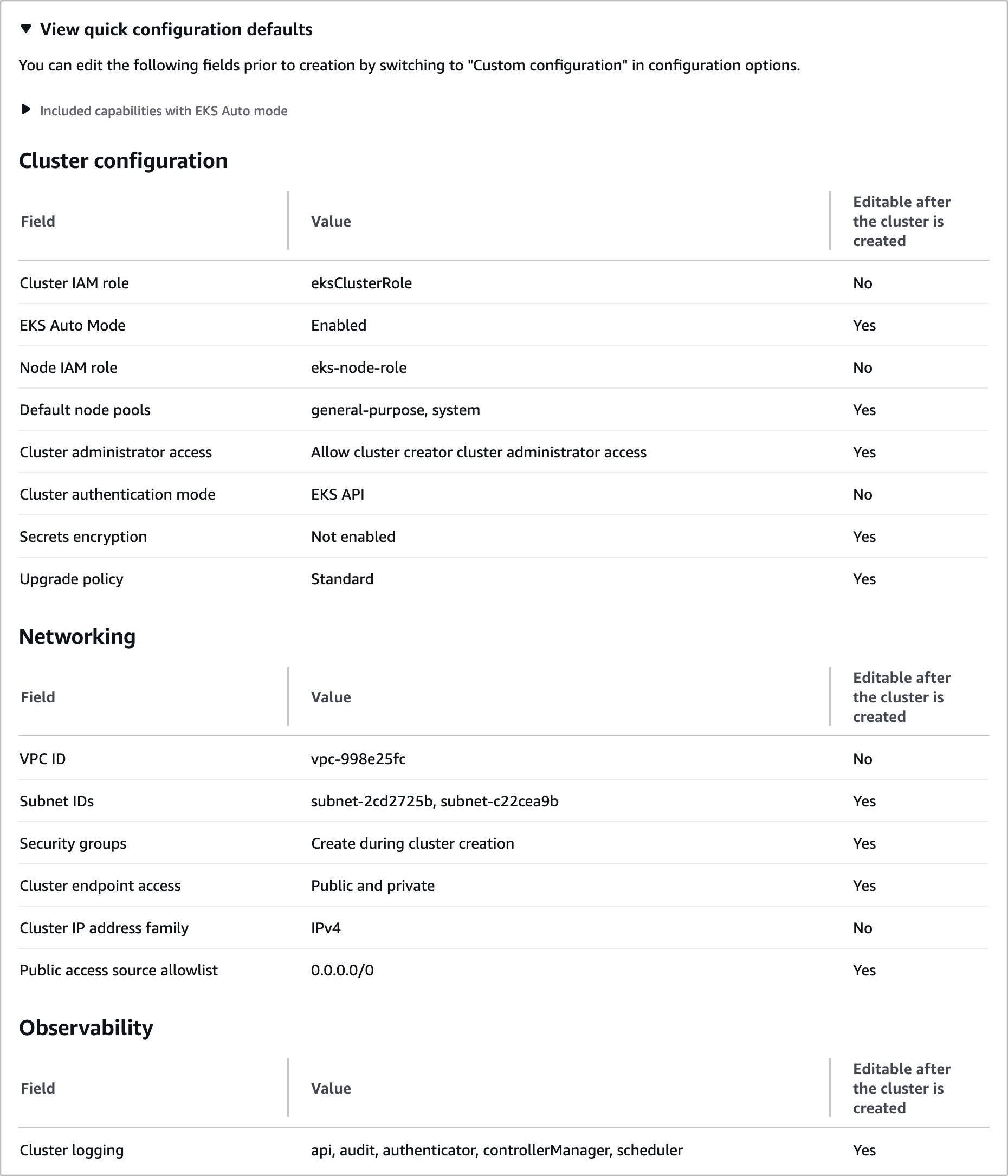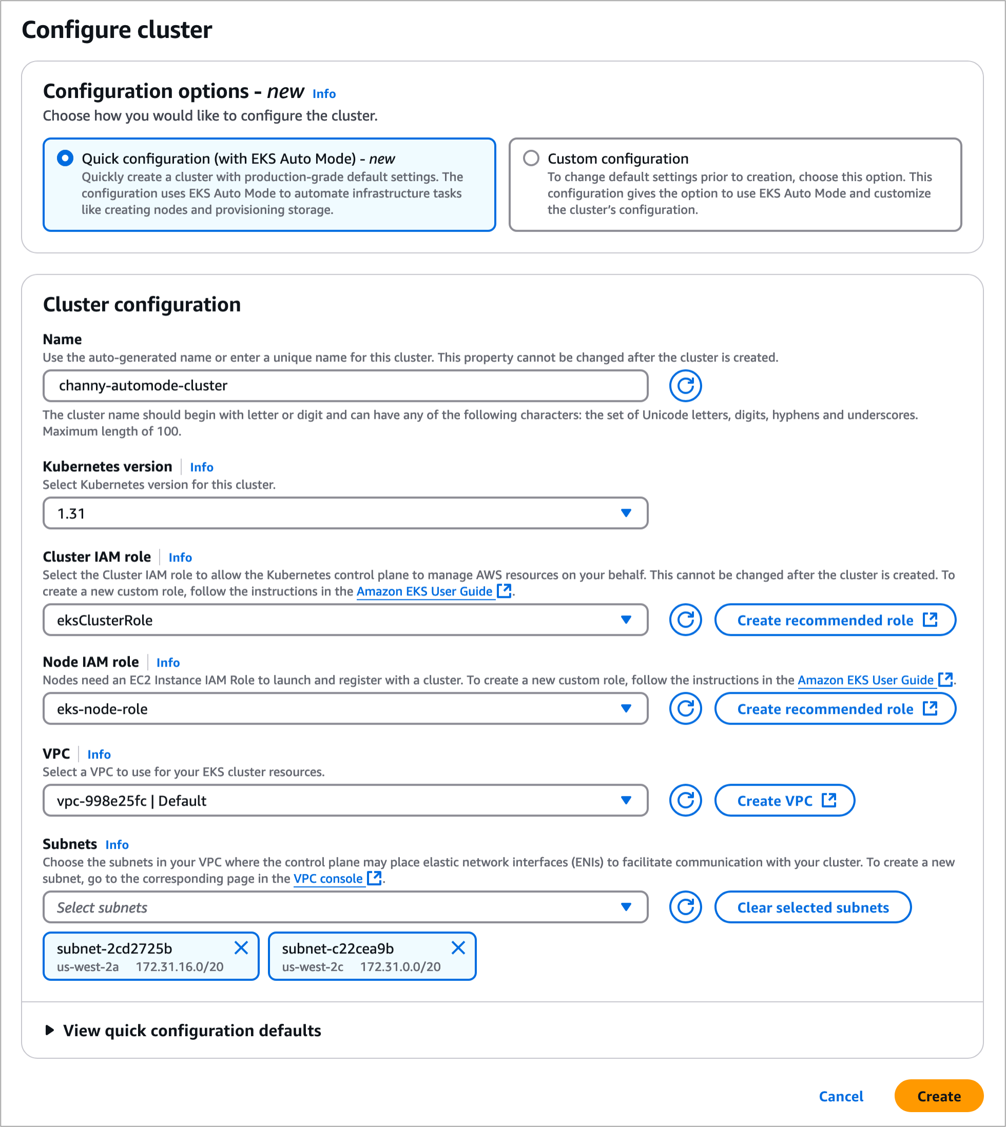 Nachdem Sie die Schnellkonfiguration gewählt haben, geben Sie Ihren Clusternamen und die Kubernetes-Version, IAM-Rollen und VPC-Subnetze ein. Sie können die Standardkonfigurationswerte im EKS-Automatikmodus anzeigen, die Sie nach der Erstellung des Clusters bearbeiten können.