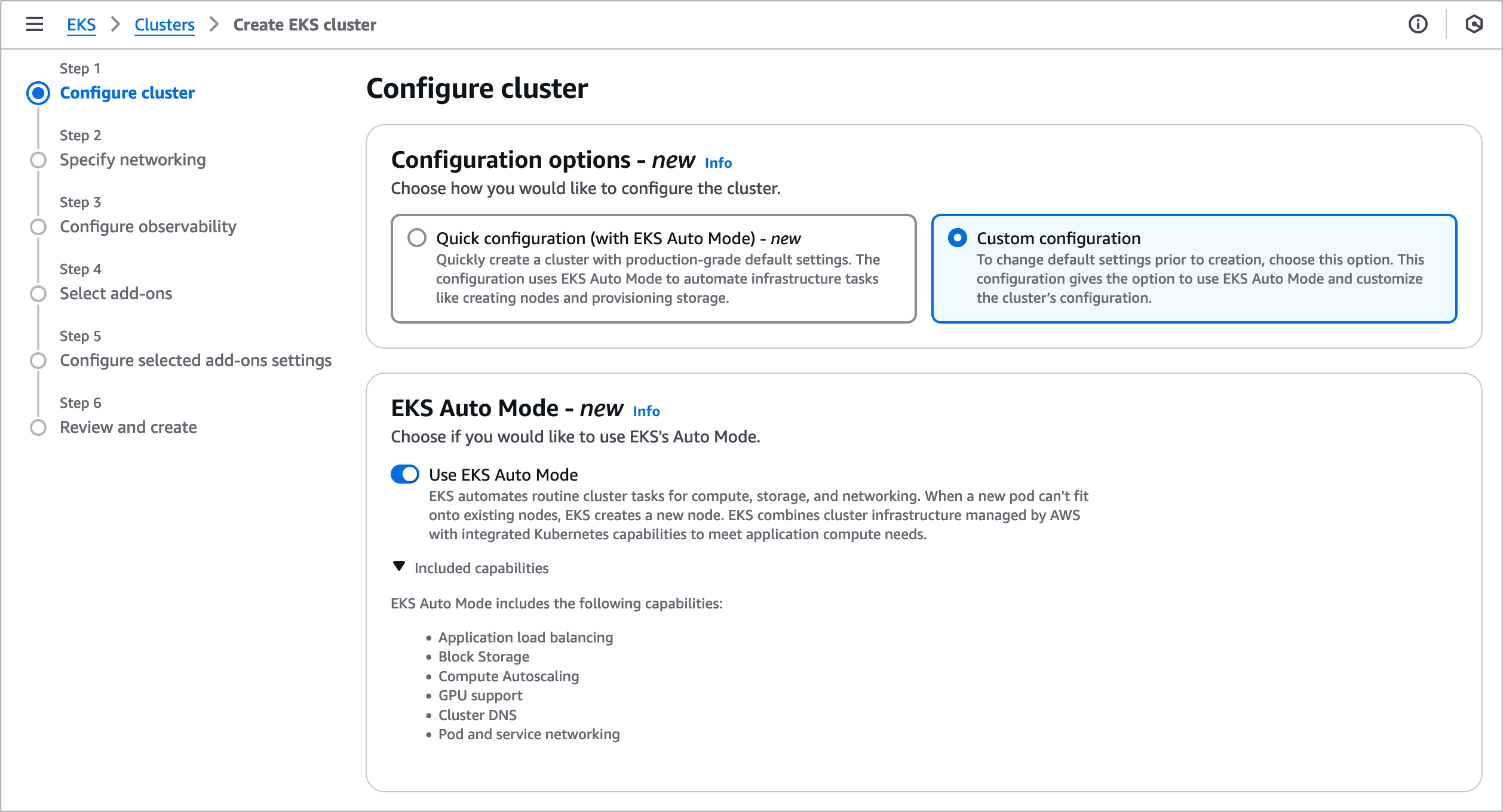 Wenn Sie Erstellen wählen, wird Ihr EKS-Cluster mit Automatikmodus in wenigen Minuten mit einem einzigen Klick bereitgestellt.Wenn Sie die Option für benutzerdefinierte Konfiguration wählen, können Sie andere Aspekte Ihres Clusters anpassen. Sie können den EKS-Automatikmodus auch in dieser Option verwenden.