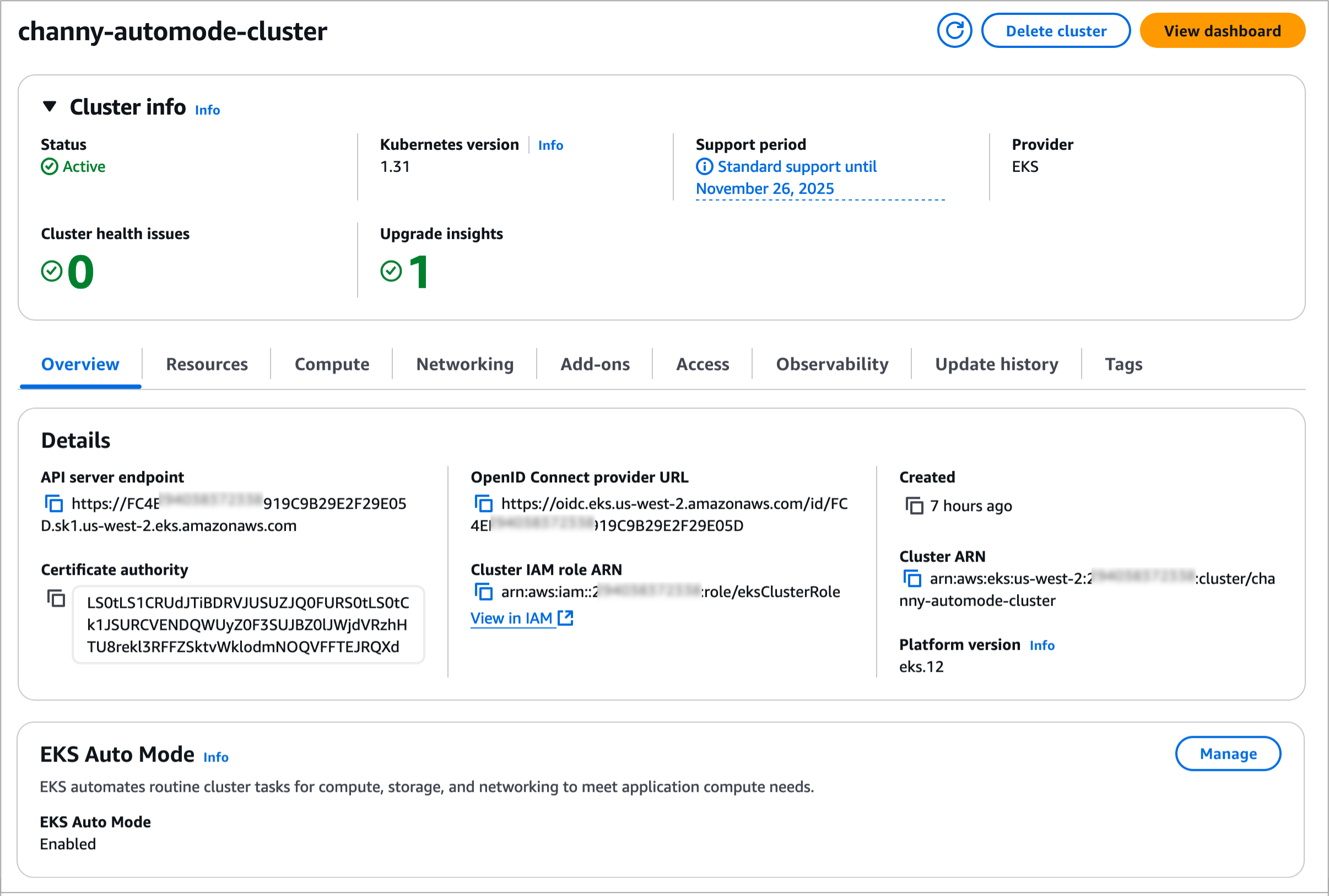 Um mehr zu erfahren, besuchen Sie Cluster mit EKS-Automatikmodus erstellen im Amazon EKS-Benutzerhandbuch.Wenn Sie den EKS-Automatikmodus für einen bestehenden EKS-Cluster aktivieren möchten, wählen Sie Verwalten im Abschnitt EKS-Automatikmodus auf der Registerkarte Übersicht auf der EKS-Cluster-Detailseite.
