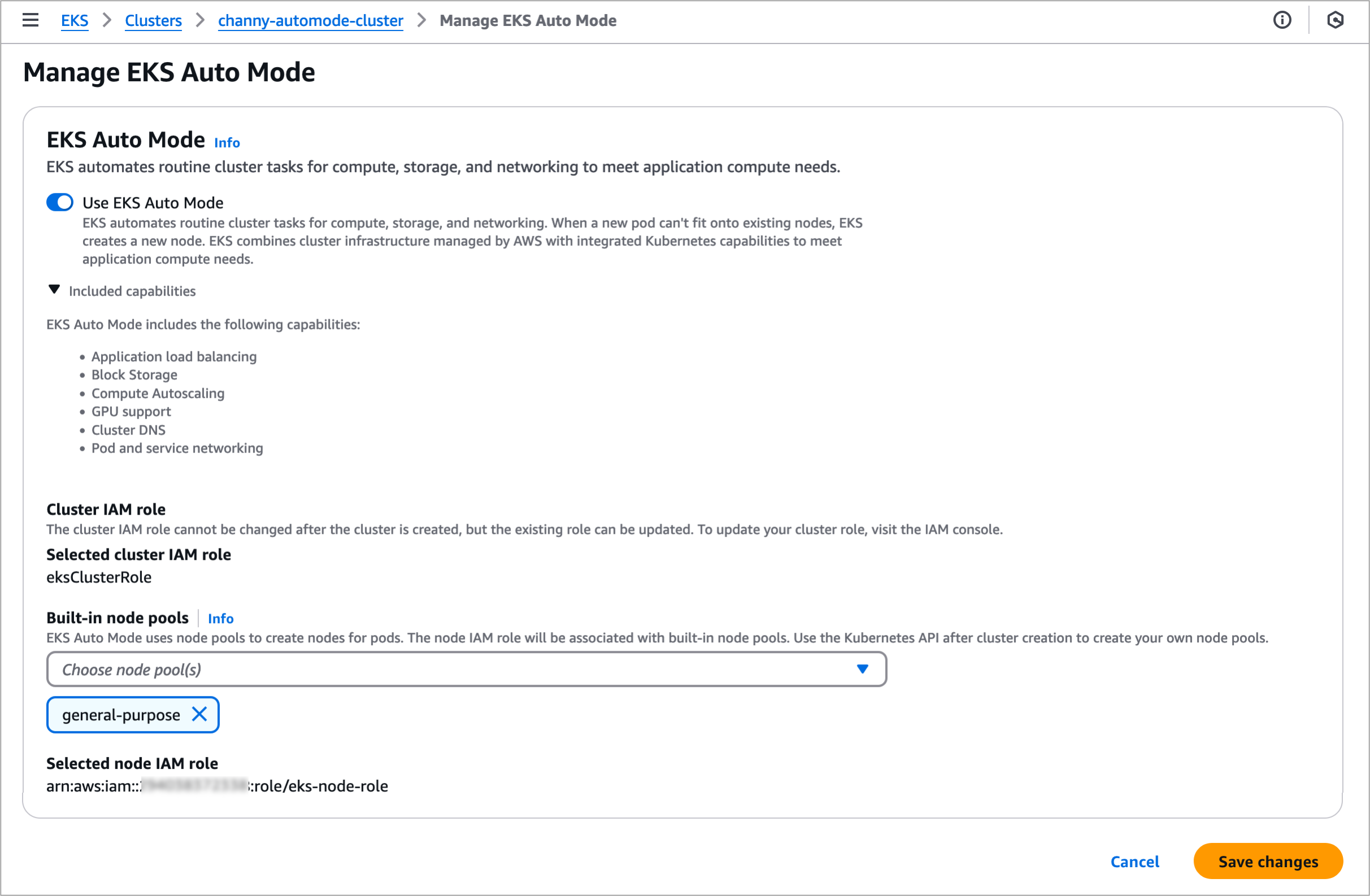 Wählen Sie das Kästchen neben EKS-Automatikmodus verwenden, um den EKS-Automatikmodus zu aktivieren. Sie können den EKS-Automatikmodus abwählen, der im Cluster konfiguriert wird. Standardmäßig werden sowohl ein System- als auch ein Standard-Node-Pool und eine Node-Klasse erstellt.