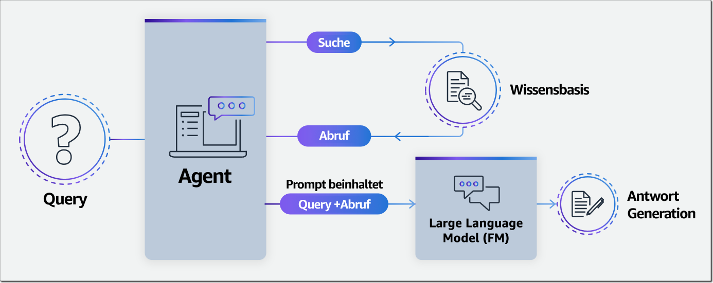 Der Ablauf beginnt mit einem Prompt der Nutzer:innen ,welcher an das Einbettungs-Modell geleitet wird. Dieses erstellt daraufhin eine Vektor-Einbettung, welche dann verwendet wird, um die Datenbank nach ähnlichen Vektoreinbettungen abzufragen und den relevantesten Text als Abfrageergebnis zurückzugeben.Das Abfrageergebnis wird dann dem Prompt hinzugefügt und die erweiterte Aufforderung wird an das FM weitergeleitet. Das Modell verwendet den zusätzlichen Kontext im Prompt, um die Generierung abzuschließen: