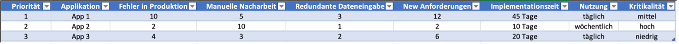 In diesem Beispiel hat Applikation 1 durch die höchste Anzahl an Fehlern, die Anzahl neuer Anforderungen und die hohe Zeit diese zu implementieren die höchste Priorität. Obwohl Applikation 2 eine höhere Kritikalität zugeordnet wurde, wird ihr nur die zweite Priorität zugewiesen. Der Hauptgrund hierfür ist die niedrige Anzahl an Fehlern, sowie wenig neue Anforderungen, die schnell umgesetzt werden können. Applikation 3 bekommt die dritte Priorität, da sie eine niedrige Kritikalität und wenige Probleme in allen Metriken aufweist.