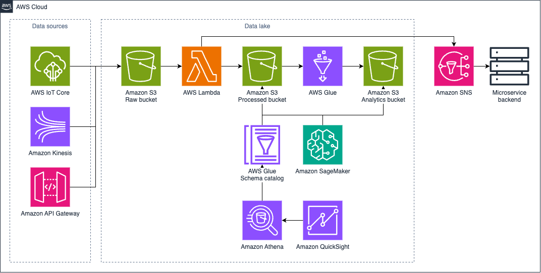 Mithilfe von AWS Glue und Amazon Athena werden dort die ersten Daten analysiert. AWS Glue dient hierbei als serverless ETL-Tool und Athena ermöglicht ad-hoc SQL-Abfragen in der AWS Management Console oder mit Amazon QuickSight. Zusätzlich wird mit Amazon SageMaker die Auswertung durch KI-Modelle unterstützt. Zudem werden die Daten weiter aufbereitet, partitioniert und mittels ETL-Jobs in den Analytics S3 Bucket gespeichert.