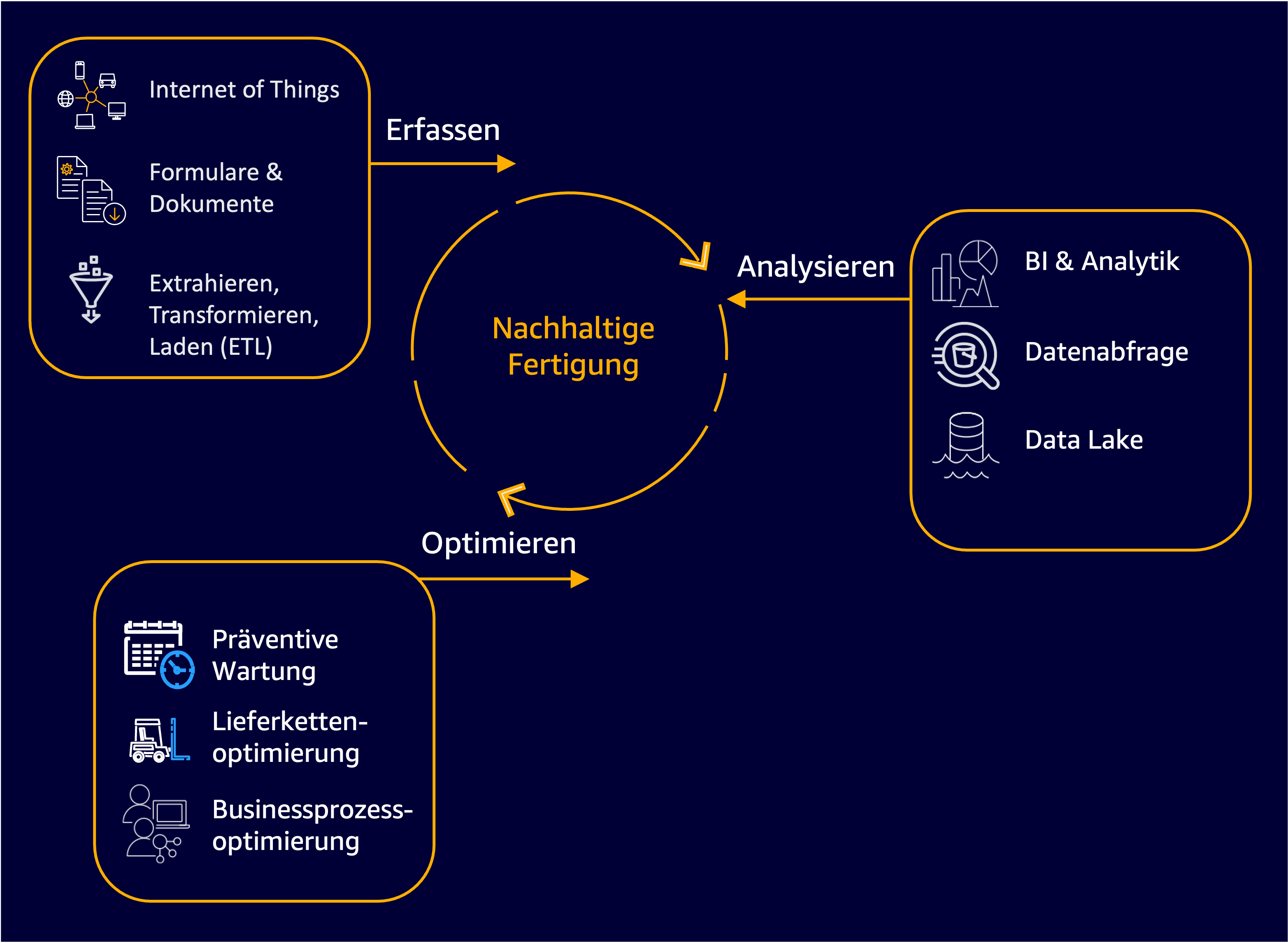 Nachhaltige Praktiken umzusetzen ist ein fortlaufender Prozess. Während sich wirtschaftliche Bedingungen, Umweltbedürfnisse und Kundenanforderungen weiterentwickeln, müssen Unternehmen ihre Vorgehensweisen überdenken und Mechanismen etablieren, um ihre Nachhaltigkeitsbemühungen kontinuierlich zu automatisieren und zu verbessern. Obwohl sich einige Teile der Nachhaltigkeitslösung je nach Betrachtungsbereich (CO2, Wasser, Energie, etc.) unterscheiden können, gibt es häufig einen dreistufigen Prozess: Erfassen, Analysieren und Optimieren. Lassen Sie uns den CO2 Ausstoß als Beispiel nehmen, um tiefer in jede Phase einzusteigen.