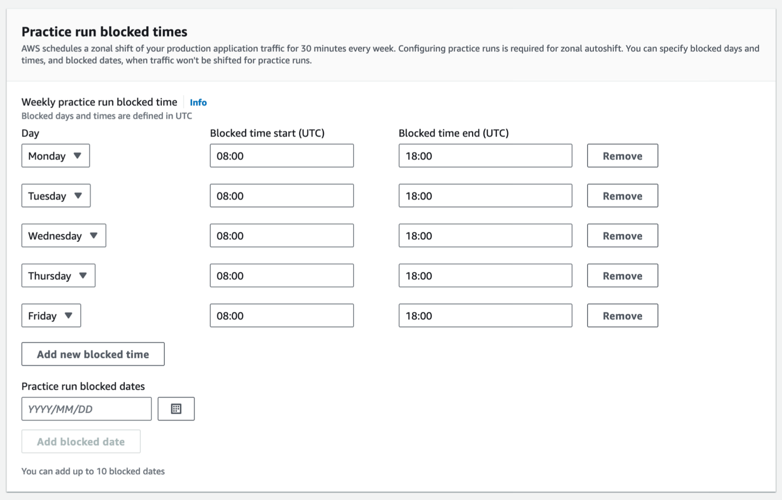 Ich scrolle auf der Seite nach unten, um die Zeiten und Tage festzulegen, an denen AWS den 30-minütigen Übungslauf nicht durchführen soll. Anfangs, um mich erst einmal an die Automatik-Umschaltung zu gewöhnen, blockiere ich die Testläufe von 08:00 bis 18:00 Uhr, Montag bis Freitag. Dabei ist zu beachten, dass die Zeiten in UTC angegeben sind und sich nicht automatisch an die Sommerzeit [Extern] anpassen. Hier kann ein UTC-Zeitrechner [Extern] hilfreich sein. Obwohl es sicher erscheint, die Geschäftszeiten anfangs auszuschließen, empfehlen wir, den Übungslauf auch während Ihrer Geschäftszeiten zu planen. So können Sie Probleme entdecken, die möglicherweise nicht auftreten, wenn wenig oder kein Verkehr auf Ihrer Anwendung ist. Die zonale Automatik-Umschaltung ist besonders wichtig, um während Ihrer Hauptverkehrszeiten reibungslos zu funktionieren. Aber wie können Sie sich sicher sein, dass sie funktioniert, wenn Sie sie nie unter diesen Bedingungen getestet haben? Ideal wäre es, keine Zeiten zu blockieren, aber wir verstehen, dass dies nicht immer praktikabel ist.