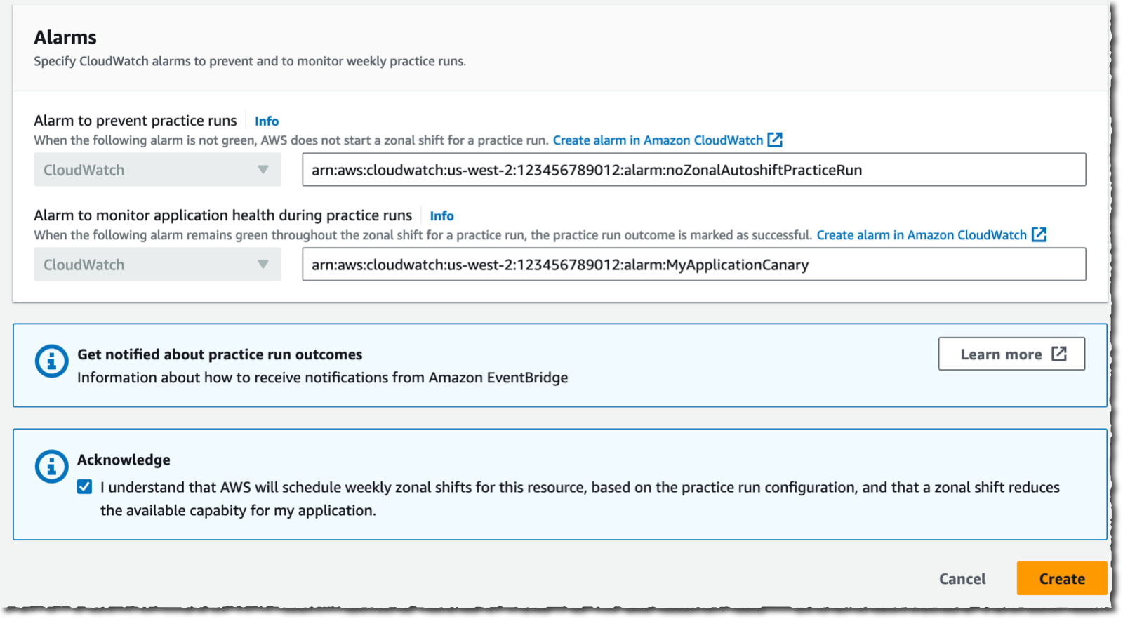 Weiter unten auf derselben Seite richte ich zwei Schutzschalter-Alarme ein. Der erste Alarm dient dazu, den Start der Übung zu verhindern. Mit diesem Alarm signalisieren Sie uns, dass es gerade kein geeigneter Zeitpunkt für einen Übungslauf ist, beispielsweise wenn es ein Problem mit Ihrer Anwendung gibt oder wenn Sie gerade eine neue Version in der Produktion einführen. Der zweite CloudWatch-Alarm zeigt das Ergebnis des Übungslaufs an. Er hilft dabei zu beurteilen, wie Ihre Anwendung auf den Übungslauf reagiert. Bleibt der Alarm grün, bedeutet das, dass der Übungslauf problemlos verlaufen ist.