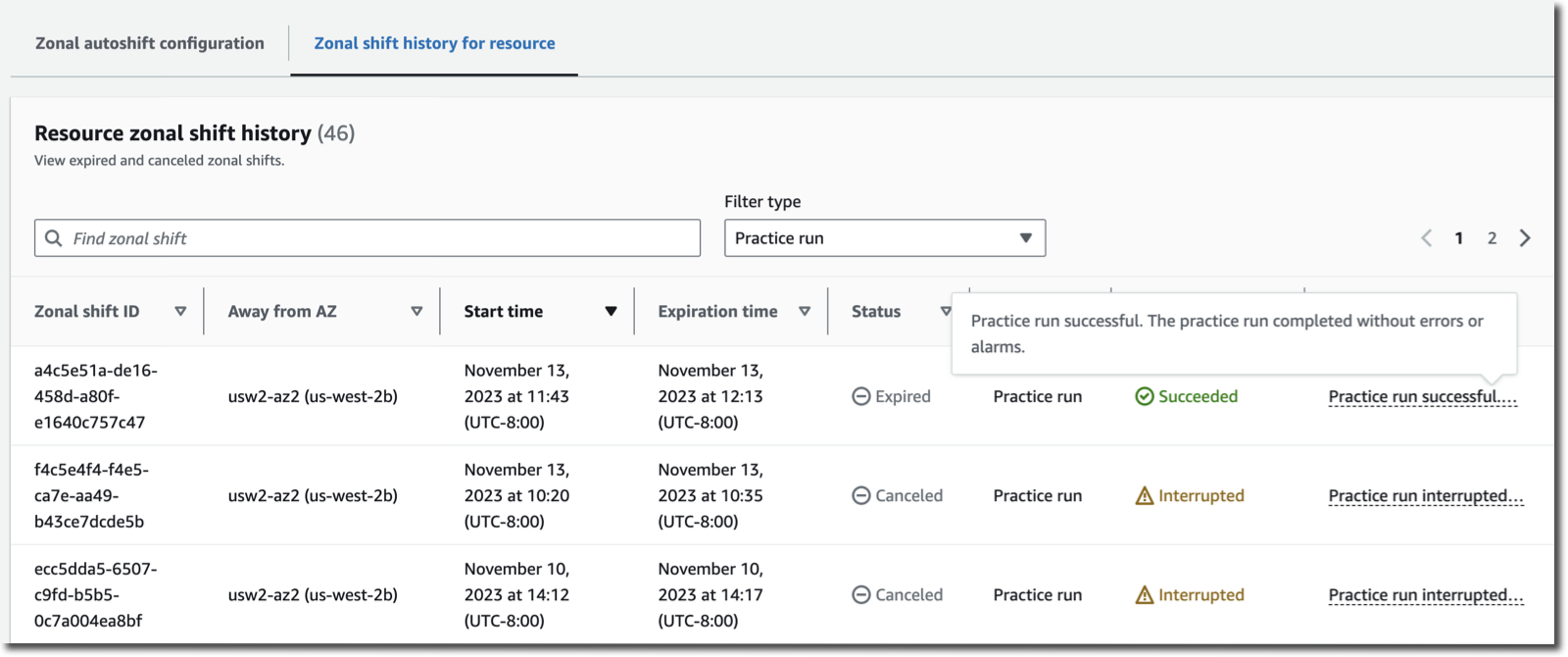 Einige Tage später überprüfe ich die Historie der Übungsläufe im Abschnitt „Zonale Umschaltungshistorie für Ressourcen“ (Zonal shift history for resource) in der Konsole. Ich beobachte die Historie meiner beiden Schutzschalter-Alarme genau, um sicherzustellen, dass alles richtig überwacht und konfiguriert ist.