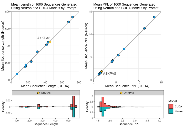 However, the tracing and bucketing approach used to enable Progen2 to run on EC2 Inf2 instance introduces some changes that could impact model accuracy. For example, Progen2-base was not trained with padding tokens, which must be added to input tensors when running on EC2 Inf2 instances. To test the effects of our tracing and bucketing approach, we compared the perplexity and sequence lengths of sequences generated using the progen2-base model on EC2 Inf2 instances to those using the native implementation of the progen2-base model on NVIDIA GPUs.