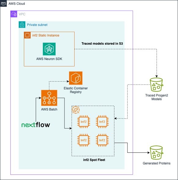 Progen2 was implemented as a batch workload following best practices. Jobs are submitted by a user, and run on a dedicated compute environment that orchestrates Amazon EC2 inf2.xlarge Spot Instances. Custom docker containers are stored on the Amazon Amazon Elastic Container Registry (Amazon ECR). Models are pulled down from Amazon Simple Storage Service (Amazon S3) by each job, and generated sequences in the form of a FASTA file are placed on Amazon S3 at the end of each job. Optionally, Nextflow can be used to orchestrate jobs, handle automatic spot retries, and automate downstream or upstream tasks. The following figure illustrates the solution architecture.
