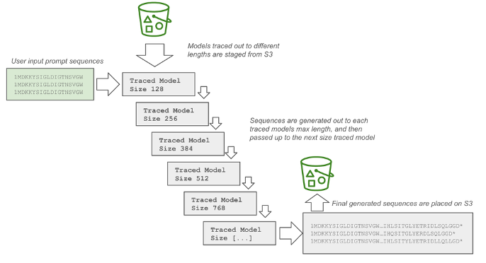 As shown in the following figure, within each individual batch job, sequences are generated by first loading the smallest bucket size from available traced models. Sequences are generated out to the max tokens for that bucket, and sequences that were generated with a stop codon or a start codon are dropped. The remaining unfinished sequences are passed up to subsequently larger bucket sizes for further generation, until the parameter max_length is reached. Tensors are stacked and decoded at the end and written to a FASTA file that is placed on Amazon S3.