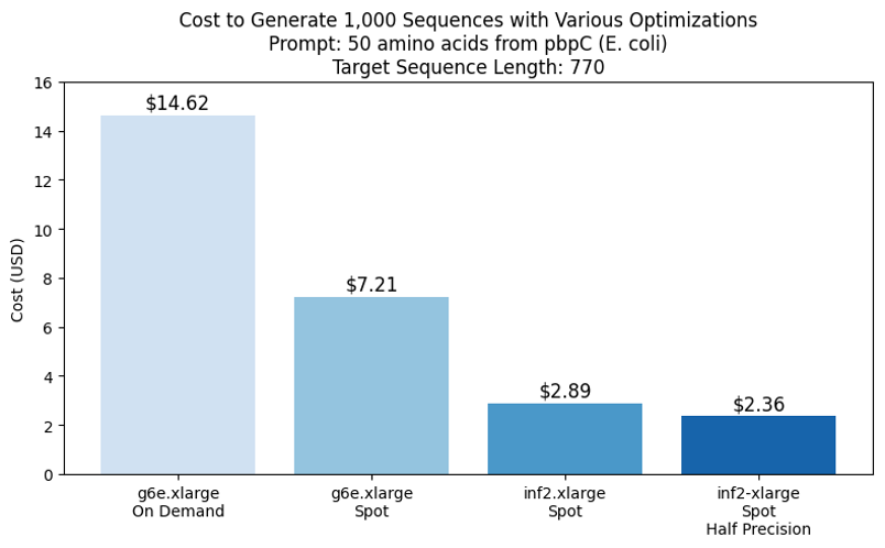 It is important to note that because the time it takes to add new tokens to the sequence during generation scales quadratically, the time and cost to generate sequences is highly dependent on the types of sequences you’re trying to generate. Overall, we observed that the cost to generate sequences depends on the specific model checkpoint used and the distribution of sequence lengths the model generated. For cost estimates, we recommend generating a small subset of enzymes with your chosen model and extrapolating costs for a larger generation set, instead of trying to calculate based on costs for previous experiments.