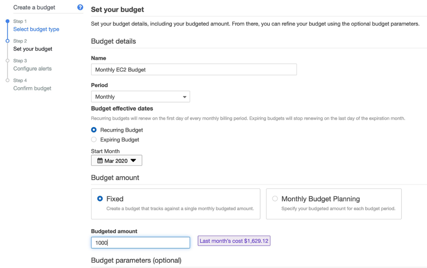 Con la herramienta de Presupuestos (Budgets), también puede configurar una alerta sobre los costes previstos (aparte de los reales). Esto le da la capacidad de adelantarse al problema y reducir los costos de forma proactiva.