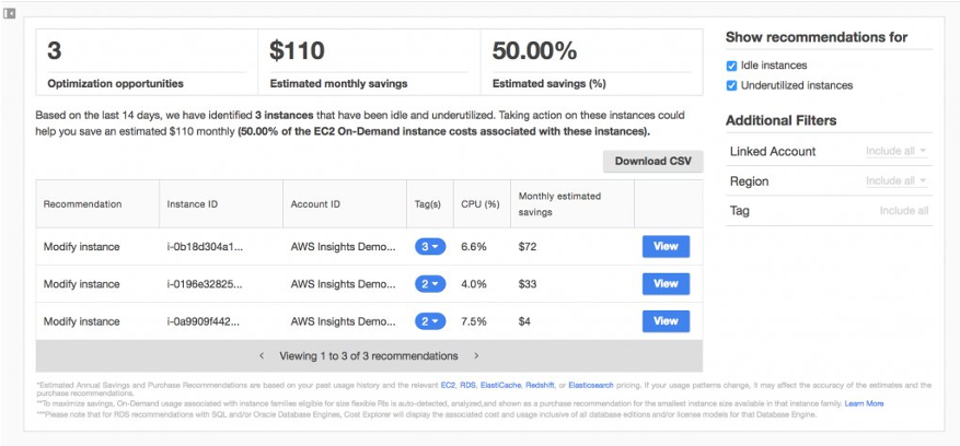 Utilice AWS Cost Explorer Resource Optimization para obtener un informe de las instancias de EC2 que están inactivas o que tienen una baja utilización. Puede reducir los costos deteniendo o reduciendo estas instancias. Utilice AWS Instance Scheduler para detener automáticamente las instancias. Utilice AWS Operations Conductor para cambiar automáticamente el tamaño de las instancias de EC2 (según el informe de recomendaciones de AWS Cost Explorer).