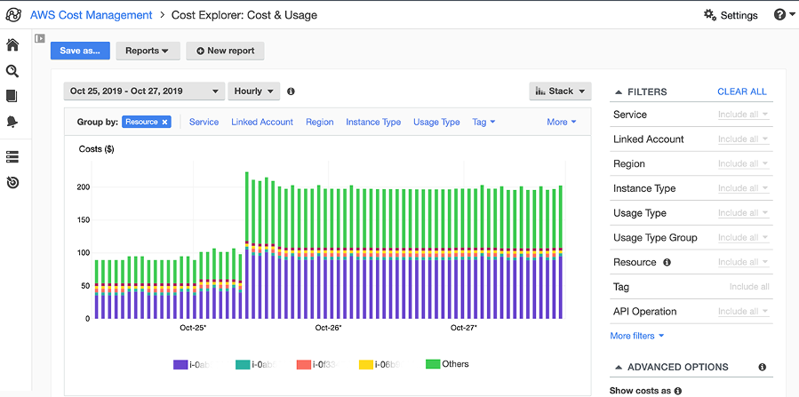A continuación, utilice AWS Cost Explorer para ver y analizar los costos y el uso de AWS. Esta herramienta proporciona informes predeterminados que le ayudan a visualizar el costo y el uso a alto nivel (por ejemplo, cuentas de AWS, servicio de AWS) o a nivel de recursos (por ejemplo, ID de instancia de EC2). Comience identificando las cuentas principales en las que incurren sus costos usando el «Informe de costos mensuales por cuenta vinculada». A continuación, identifique los principales servicios que contribuyen a los costos dentro de esas cuentas. Para ello, utilice el «Informe de costes mensuales por servicio». Utilice las etiquetas y granularidad por hora y nivel de recursos para filtrar e identificar los principales recursos que incurran en costos.