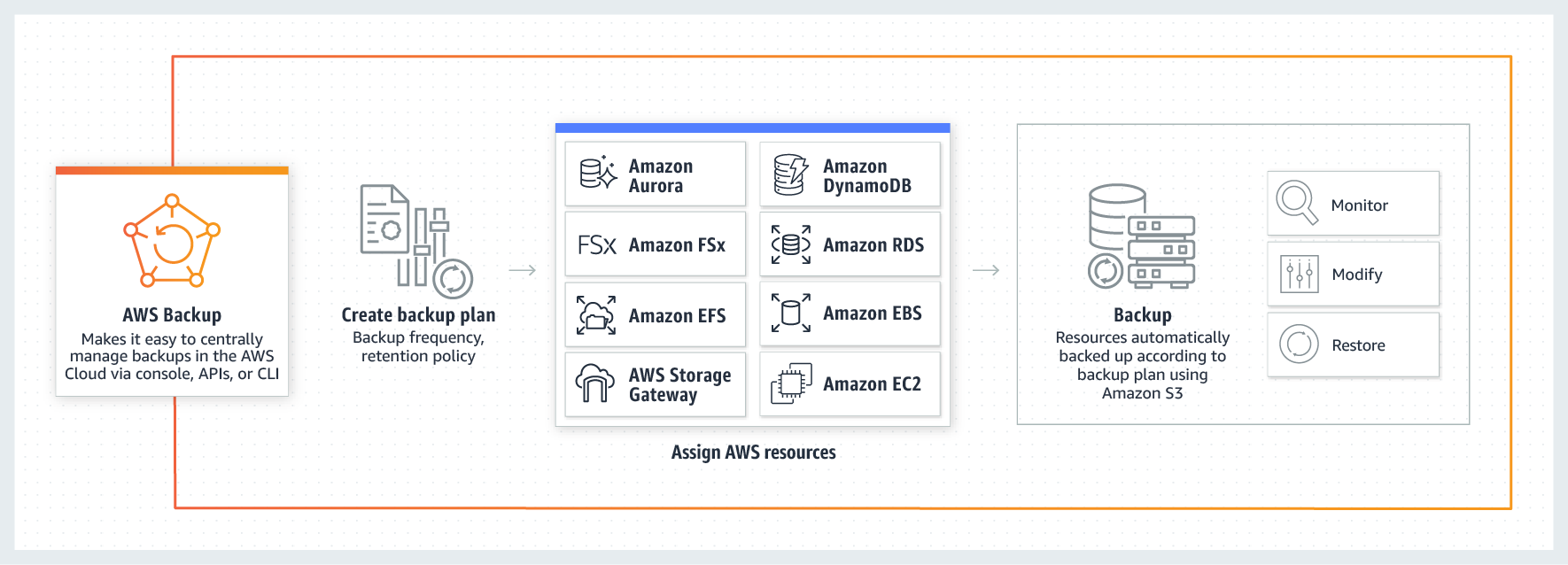 En AWS hay algunos servicios que pueden usarse como respaldo del almacenamiento de datos, como por ejemplo AWS Backup , que proporciona una plataforma centralizada y administrada para realizar copias de seguridad de información alojada en servicios de AWS como Amazon EBS, EC2, EFS, FSx, RDS, DynamoDB y volúmenes de Storage Gateway.
