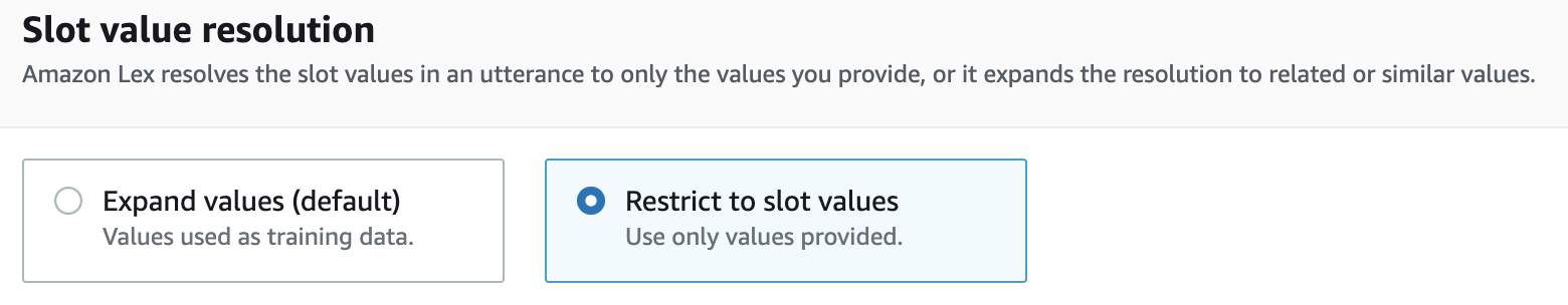 - En el Slot value resolution, seleccione Restrict to slot values.