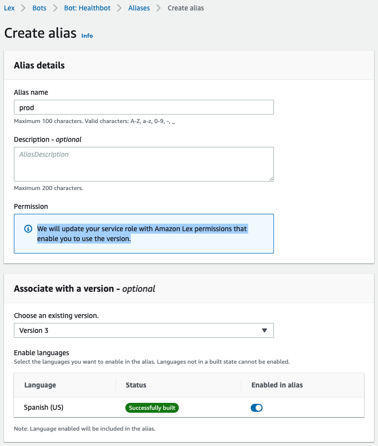 - Cuando la compilación esté completa, en la página de Bot versions, elija Create.