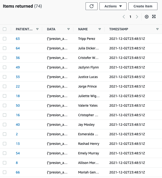 Asegúrese de ejecutarlo durante al menos un minuto para que la tabla en DynamoDB esté correctamente poblada. Nuestro asistente de voz solo consulta los datos más recientes insertados en la tabla, por lo que puede detenerlo después de que se ejecute una vez. Los ID de paciente generados están entre 0 y 99.