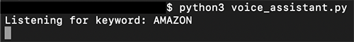 Tu computadora está escuchando la palabra de activación que estableciste anteriormente (o la «Hola Amazon» predeterminada) y no comienza a grabar hasta que detecta la palabra de activación. La detección de la palabra de activación se procesa mediante el decodificador de PocketSphinx. El decodificador busca continuamente KEYPHRASE o WakeWord en el canal de audio.
