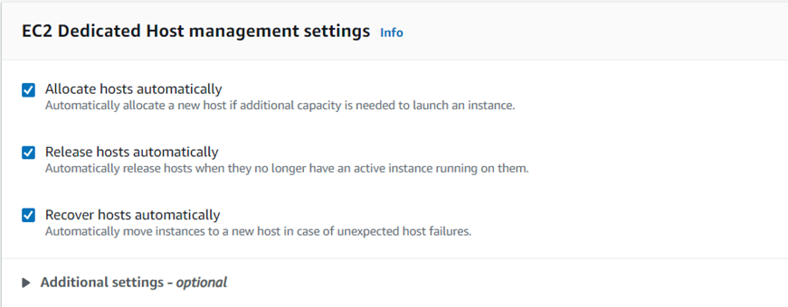 3. En la configuración de administración de host dedicado de EC2, puede dejar los valores predeterminados, lo que permitirá al grupo de recursos de host administrar el host dedicado.