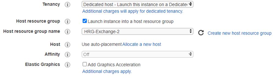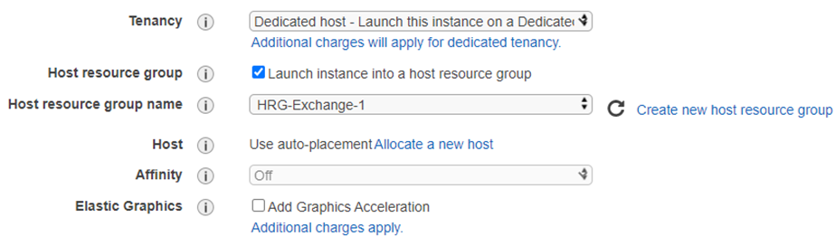 Figura 11: Configuración del Asistente de inicio de EC2 con tenencia establecida en Hosts dedicados, la opción de grupo de recursos de host marcada y el nombre del grupo de recursos de host especificado en HRG-Exchange-1.