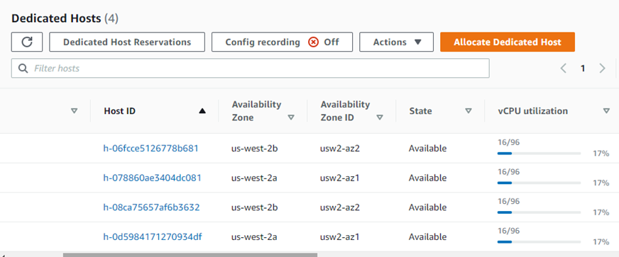 Esto asignará dos hosts dedicados adicionales en cada zona de disponibilidad para un total de cuatro. Las instancias adicionales que inicie con estos dos grupos de recursos de host utilizarán la capacidad restante de los hosts dedicados. Para verificarlo, vaya a la consola EC2 y seleccione «Hosts dedicados» en el panel izquierdo para ver los cuatro hosts.
